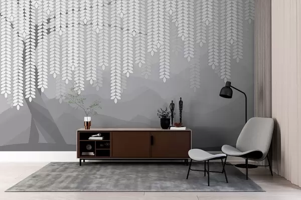 Murale Saule stylisé avec des feuilles pendantes sur fond de montagnes minimalistes dans des tons de gris. w05232v3