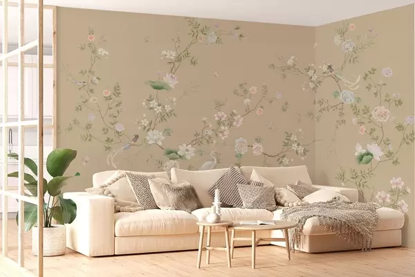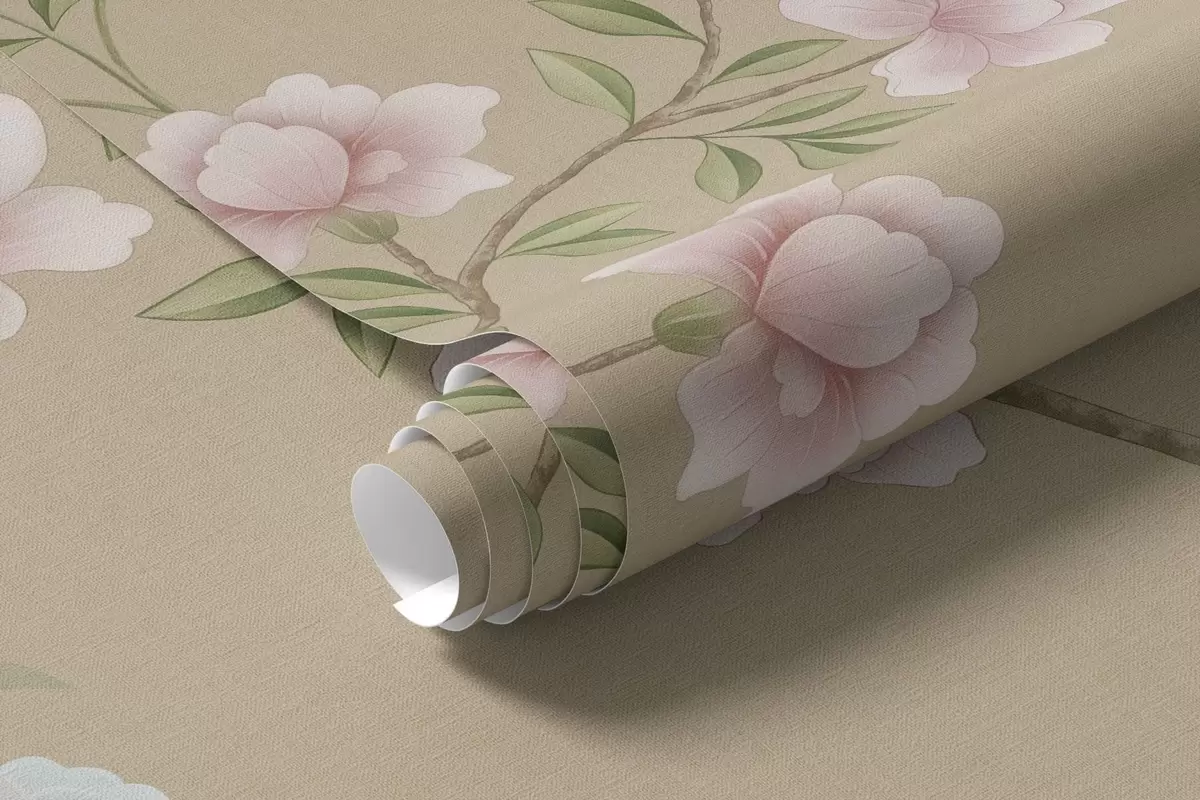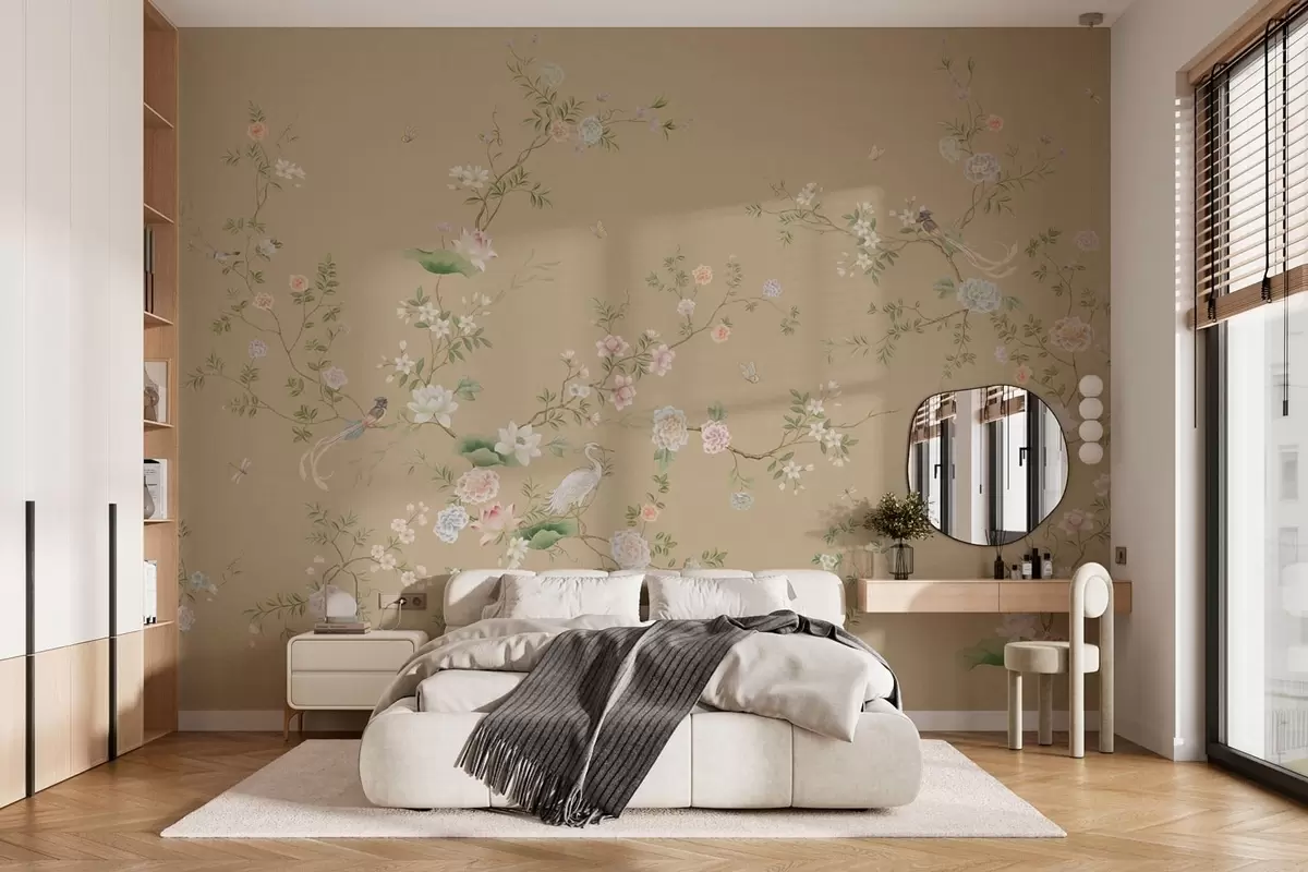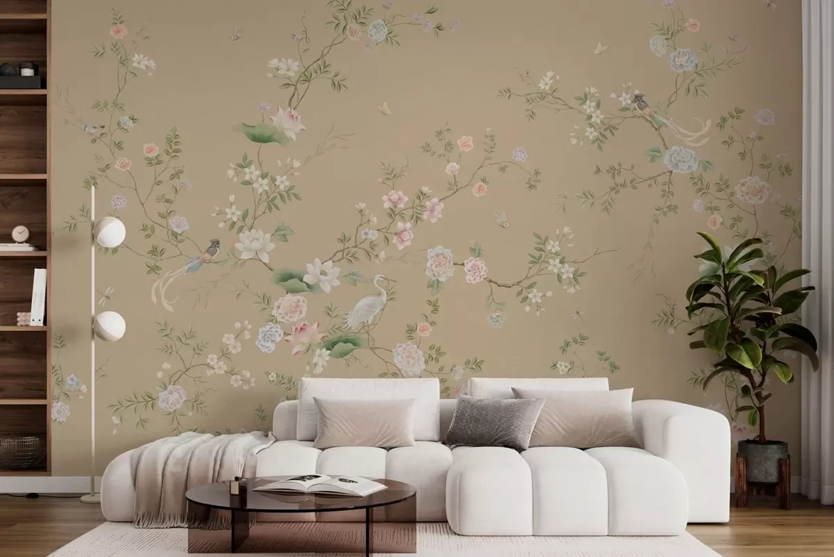 Peintures murales Branches fleuries avec des oiseaux sur fond beige clair Nr. w05416v2