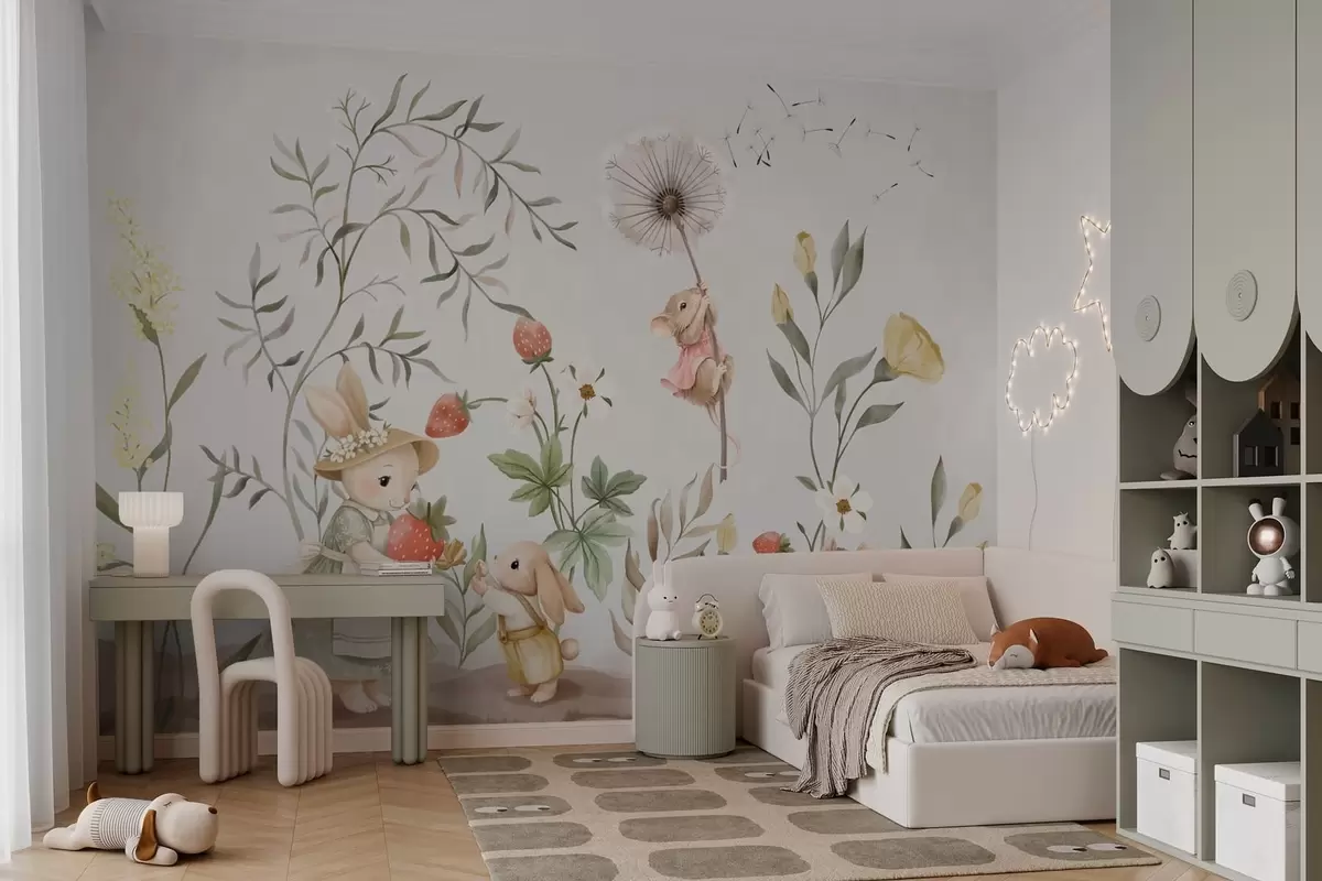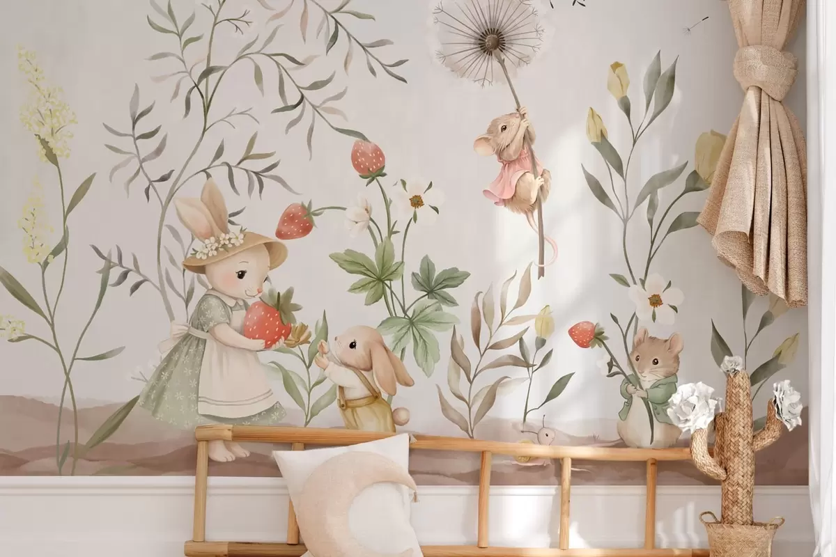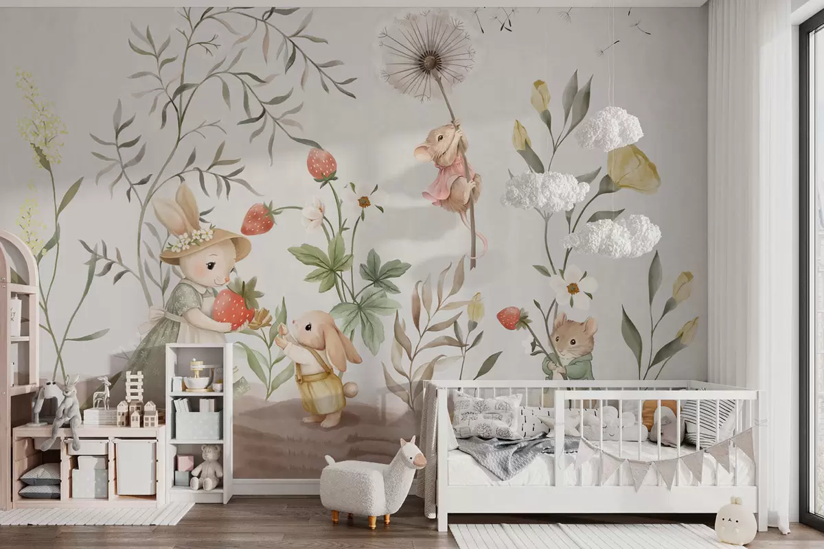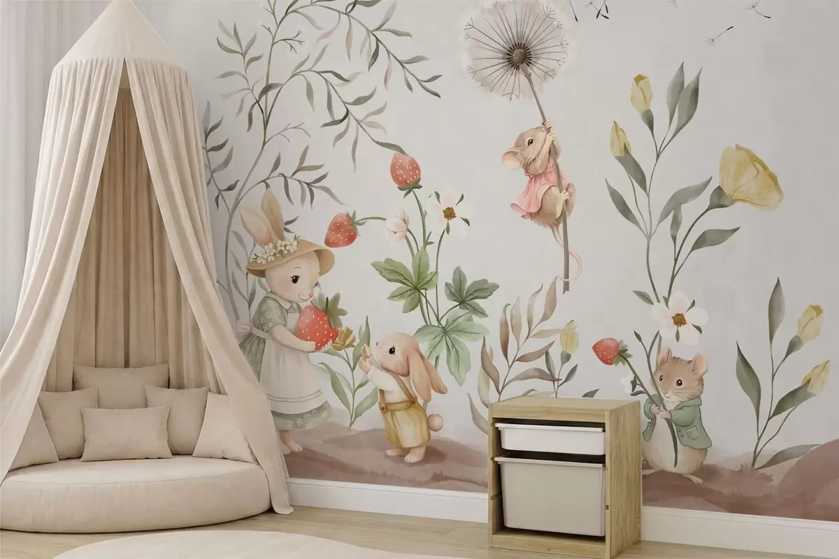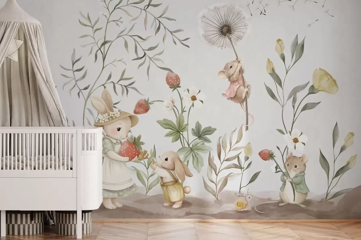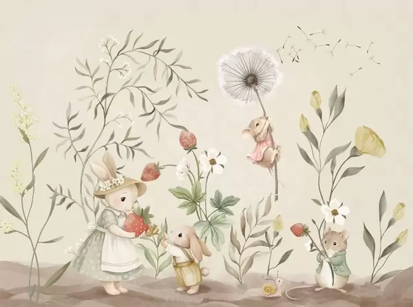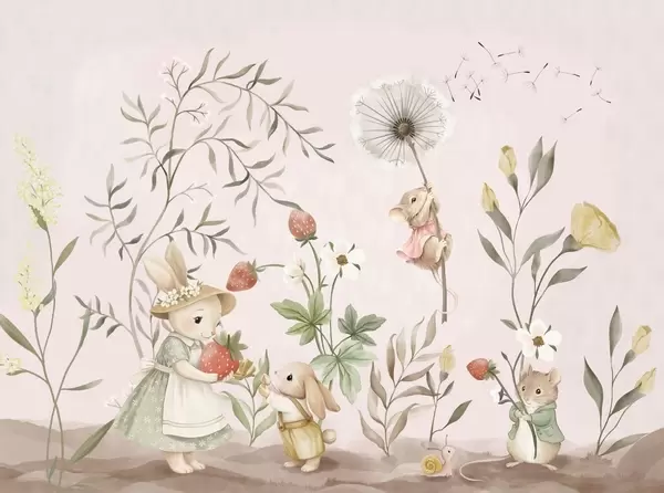 Peintures murales Illustration pour enfants représentant un lapin et une souris parmi des plantes et des fleurs Nr. w05422