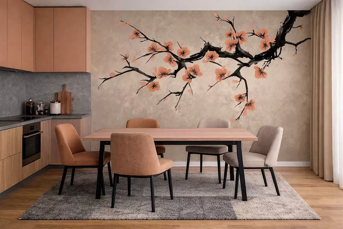 Peintures murales Branche fleurie de fleurs de pêcher sur fond texturé Nr. w05425v3