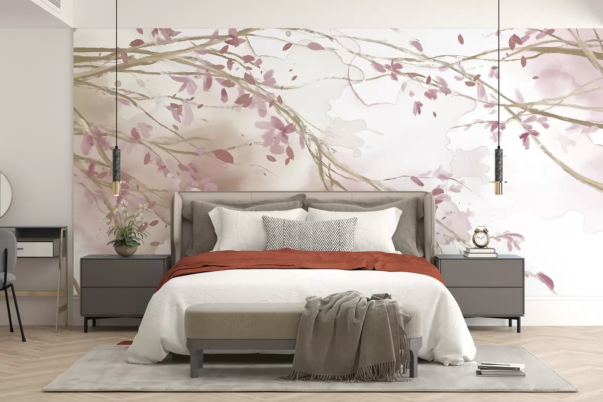 Peintures murales Branches florales roses et blanches délicates avec fond aquarelle doux et flou Nr. w07919v1