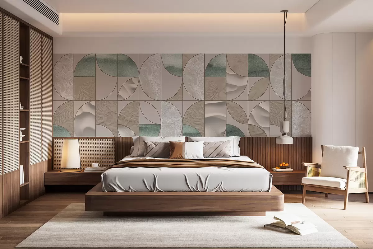 Peintures murales Un motif géométrique de textures vertes, beiges et blanches disposées dans un motif abstrait répétitif Nr. w07928