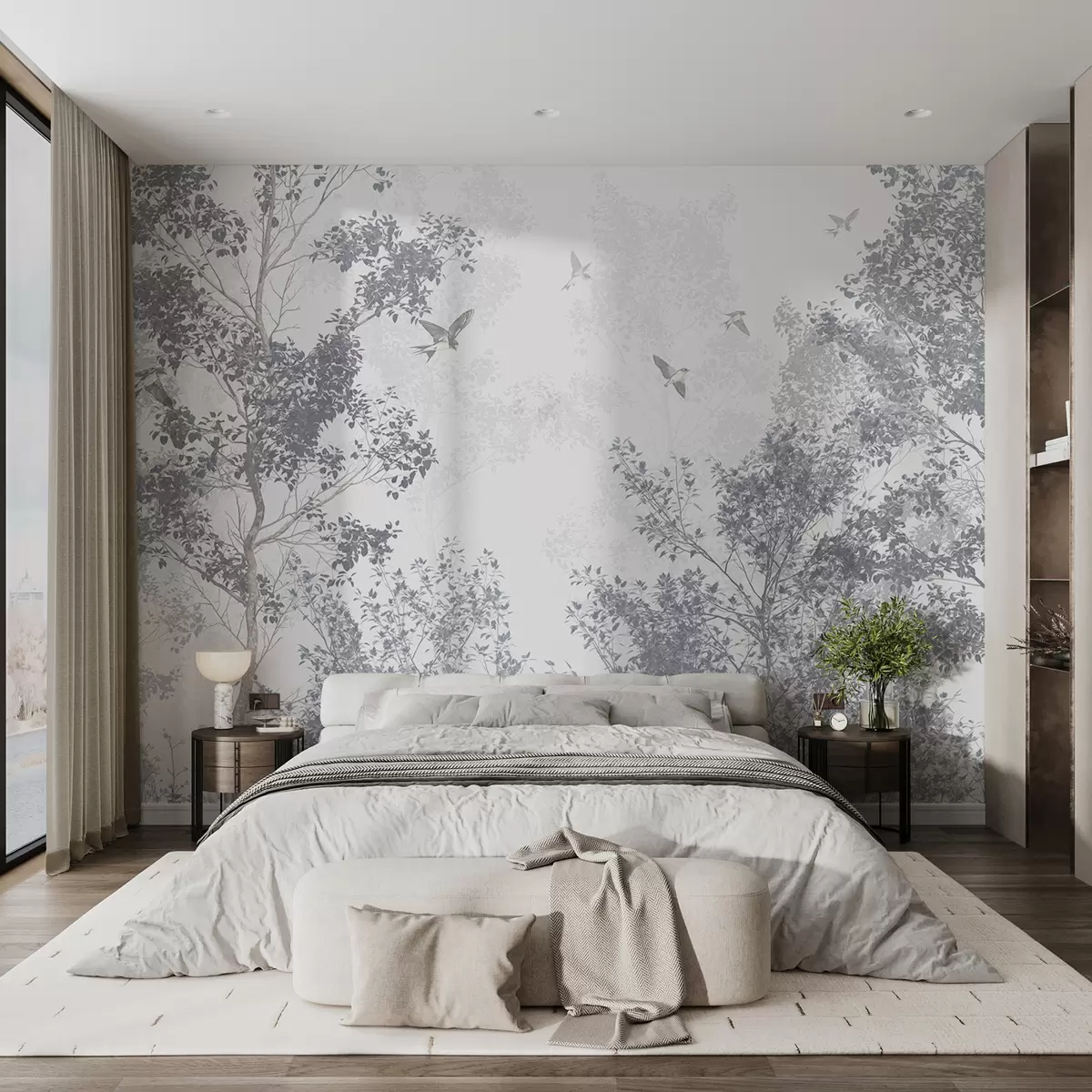 Peintures murales Arbres aux feuilles et branches grises avec des oiseaux volant dans le ciel, fond blanc Nr. w07982v1
