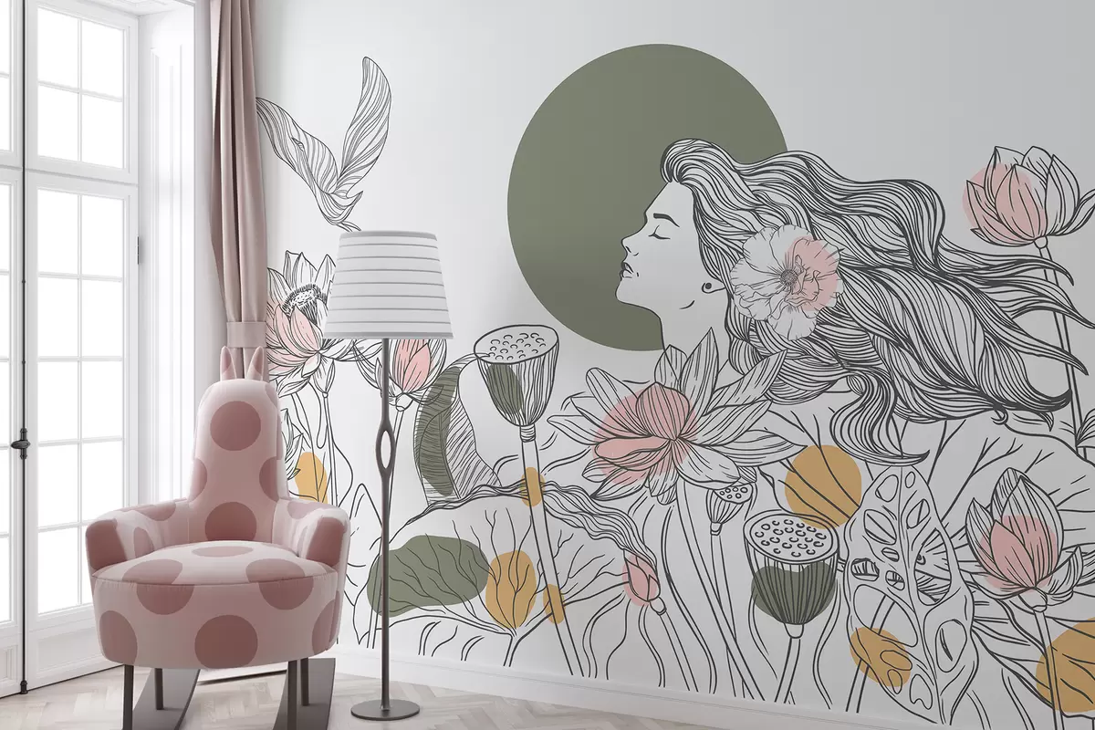 Peintures murales Femme dans la nature, dessin au trait, fleurs de lotus, grandes feuilles, oiseaux volants, couleurs pastel Nr. w07988v6