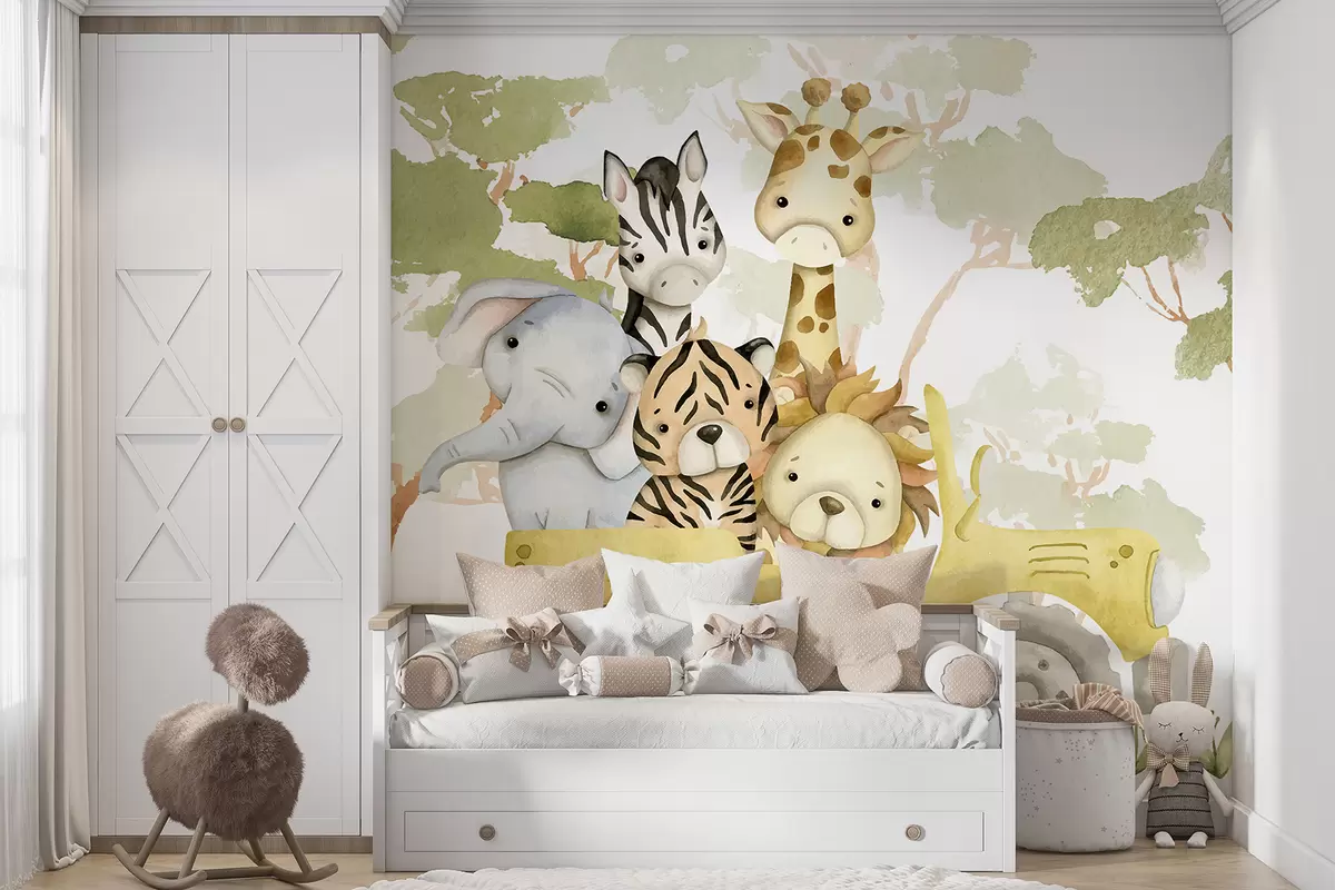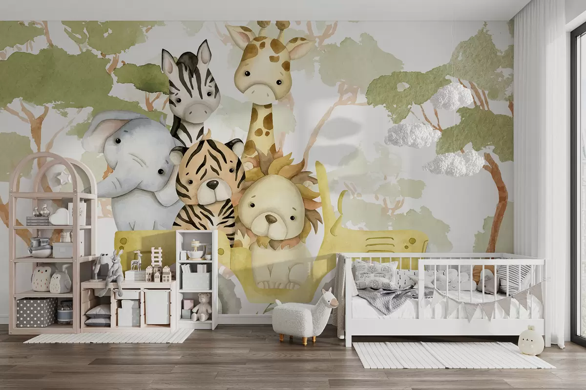 Peintures murales Un camion jouet jaune transportant une girafe, un tigre, un lapin et un éléphant, sur un fond de feuillage vert Nr. w08233