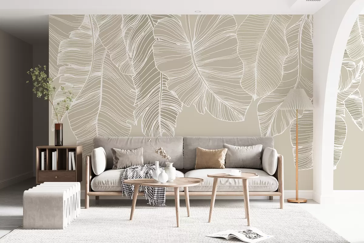 Peintures murales Feuilles florales tropicales blanches sur fond beige clair, design d'art au trait minimaliste Nr. w08235