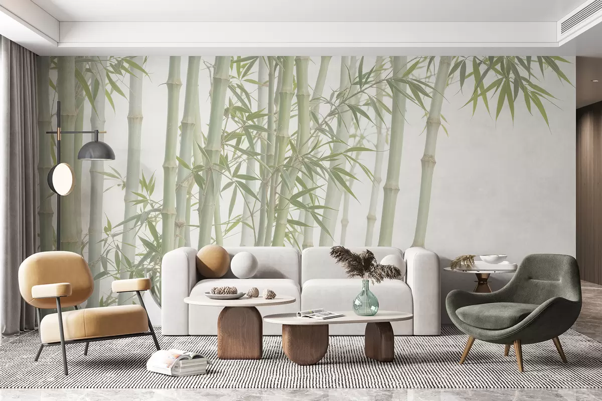 Peintures murales Une forêt de bambous dense avec de hautes tiges de bambou et des feuilles vertes sur un fond doux et brumeux Nr. w08237