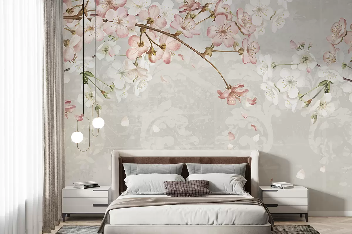 Peintures murales Fleurs de cerisier roses et blanches en pleine floraison, avec des pétales doux tombant sur un fond beige texturé Nr. w08254v1