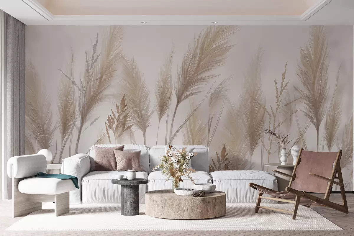 Peintures murales De grands brins d'herbe beige en épis se balançant dans le vent sur un fond doux et clair Nr. w08268