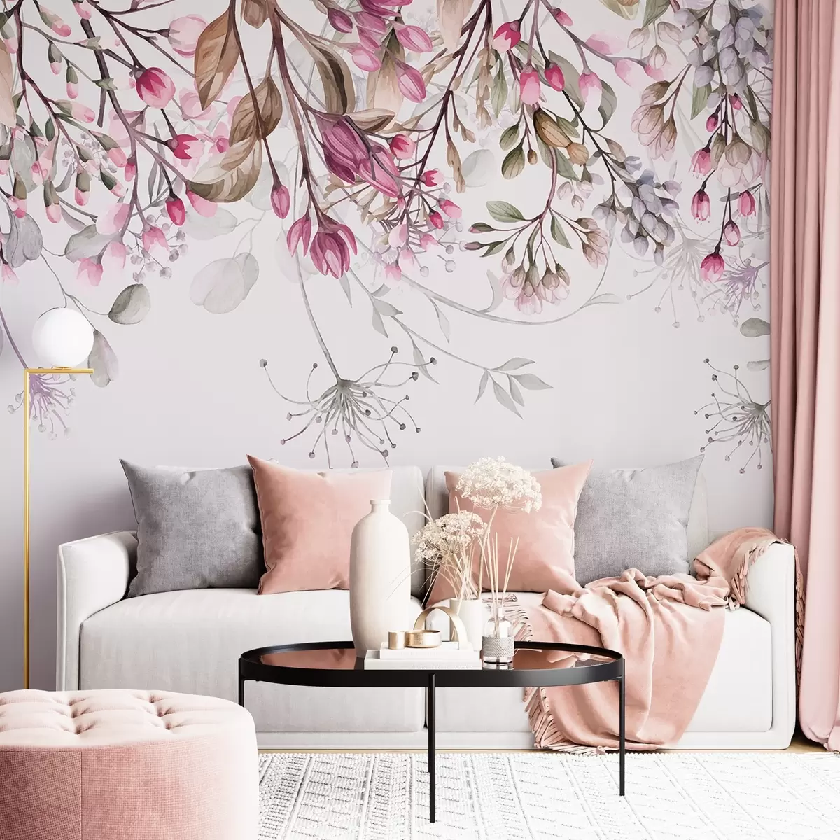 Peintures murales Délicates branches florales roses et blanches avec feuilles et pétales, sur fond gris pastel Nr. w08347
