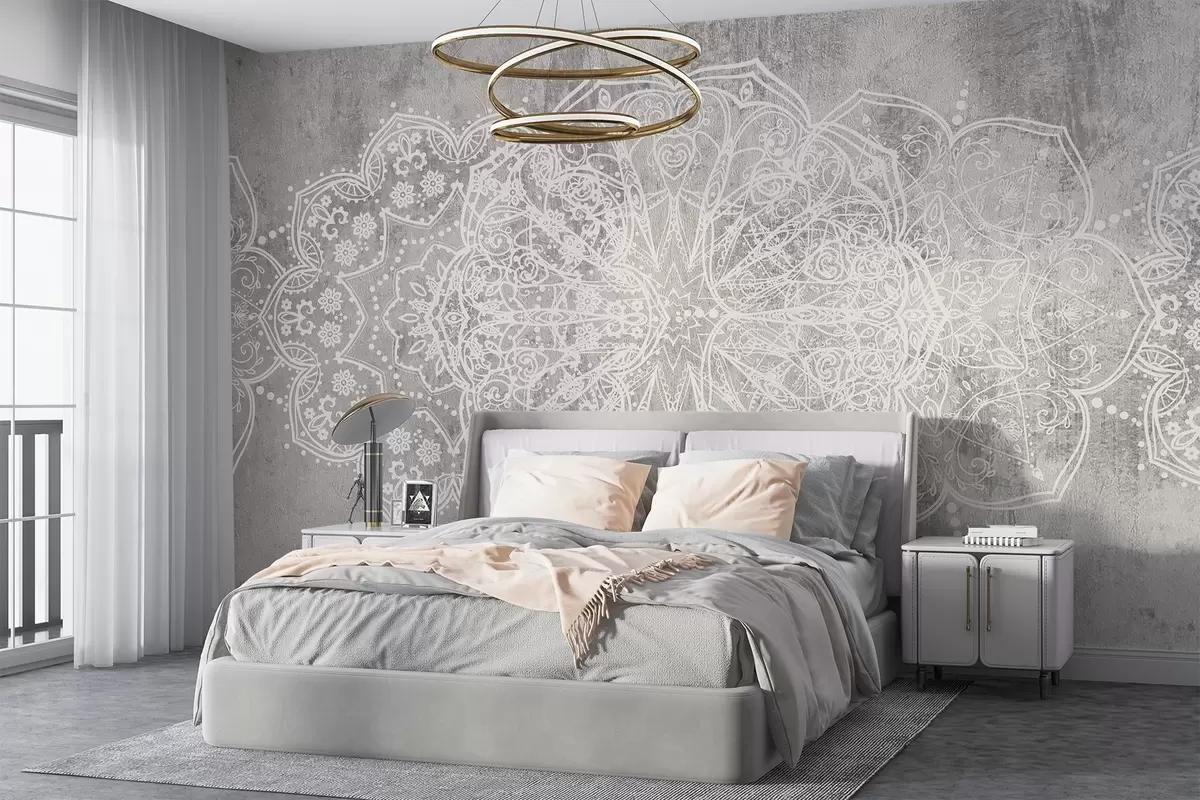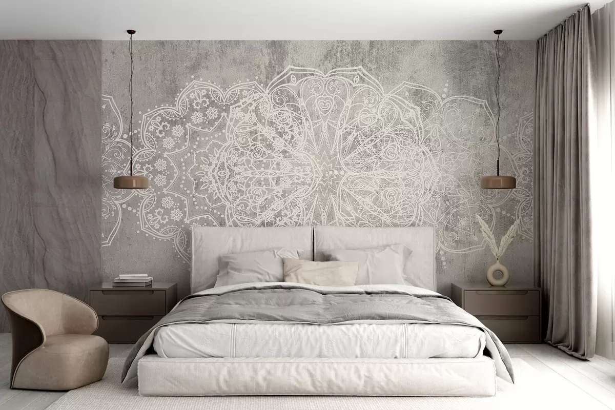 Peintures murales Un motif de mandala en dentelle blanche, détaillé et complexe, sur un fond de mur gris loft texturé Nr. w08387
