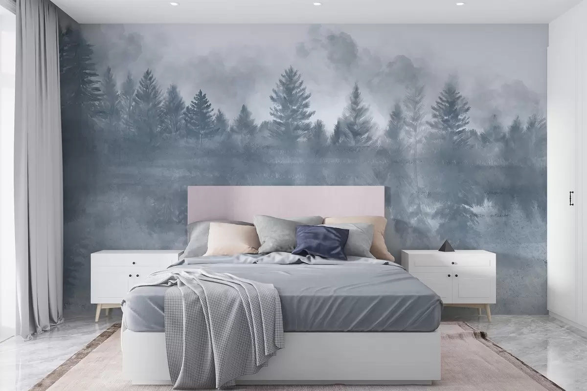 Peintures murales Un paysage serein avec un lac gelé entouré d'une dense forêt de pins, dans une atmosphère brumeuse Nr. w08415