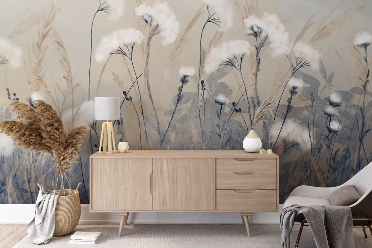 Peintures murales Herbe blanche cotonneuse sur un fond texturé flou, dans une atmosphère douce, brumeuse et sereine Nr. w08416