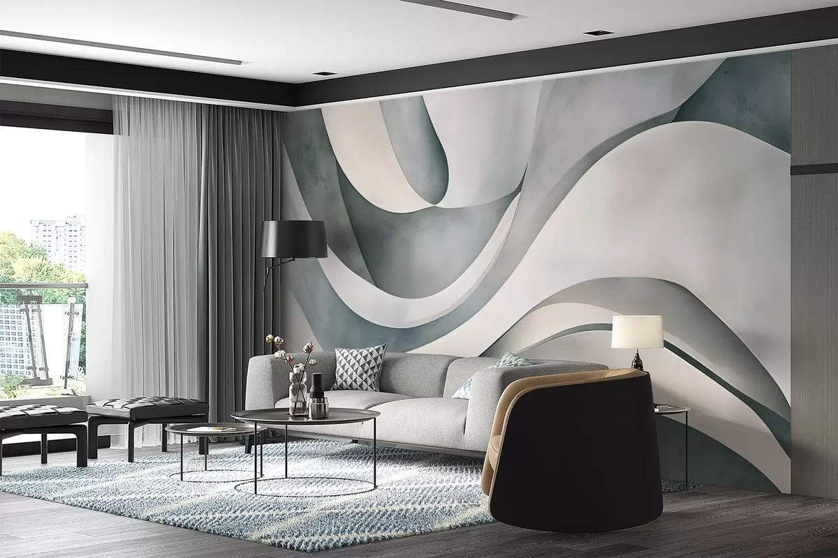 Peintures murales Formes courbes blanches, bleues et grises, créant une impression abstraite, texturale, moderne et minimaliste Nr. w08439v1