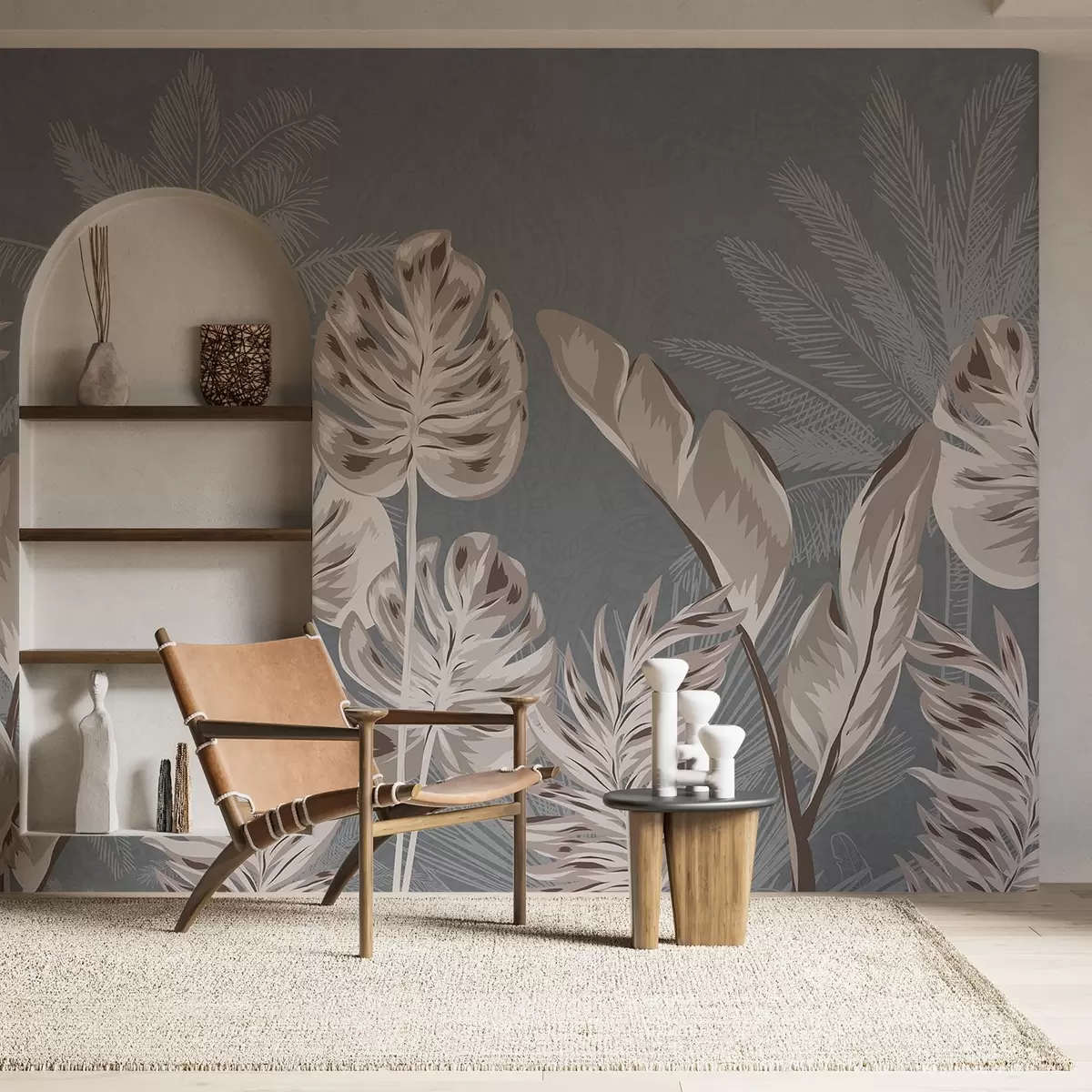 Peintures murales De grandes et délicates feuilles beiges sur un fond gris mat, créant une atmosphère sereine et éthérée Nr. w08449