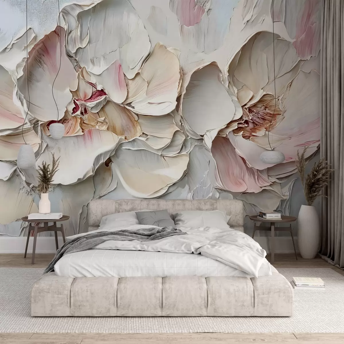 Peintures murales Délicates fleurs rose pâle aux pétales doux et superposés sur un fond texturé et atténué imitation peinture à l'huile impasto Nr. w08467