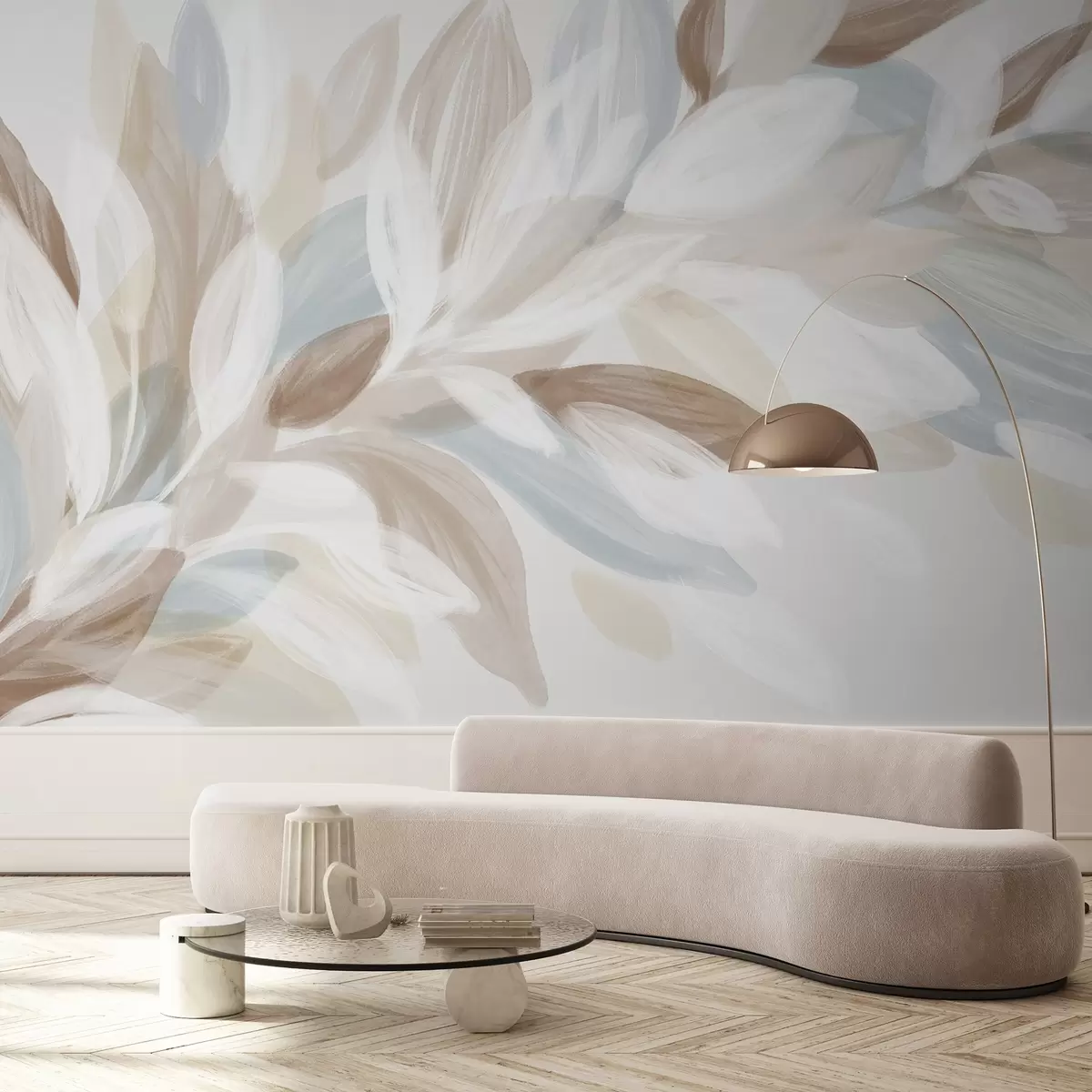 Peintures murales Feuilles douces aux couleurs pastel dans les tons blanc, beige et bleu clair, créant une composition délicate et éthérée Nr. w08649