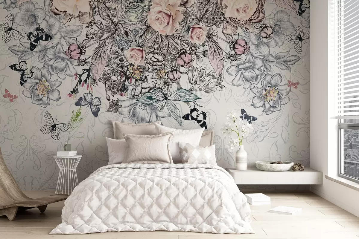 Murale Dessin floral avec des roses roses et diverses fleurs et papillons avec un dessin au trait complexe sur fond texturé w08674