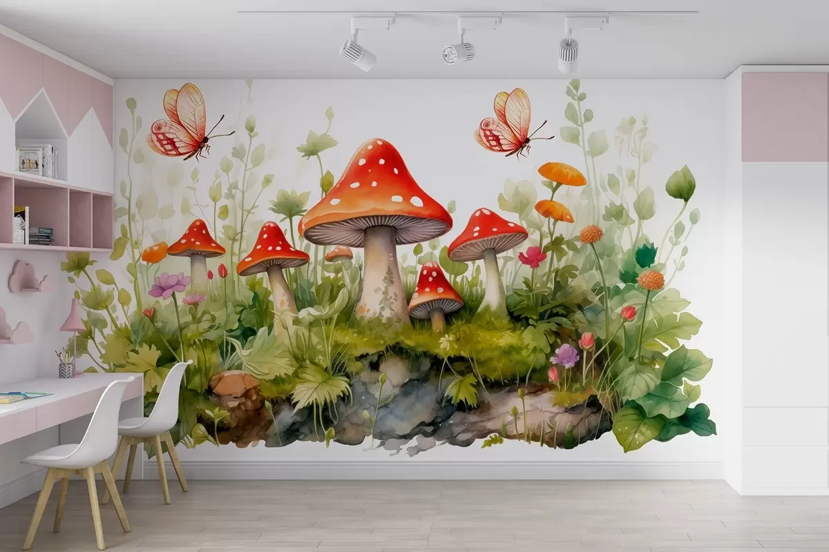 Peintures murales Paysage de forêt sur fond blanc en style aquarelle avec des champignons, des grenouilles et des papillons Nr. w08854