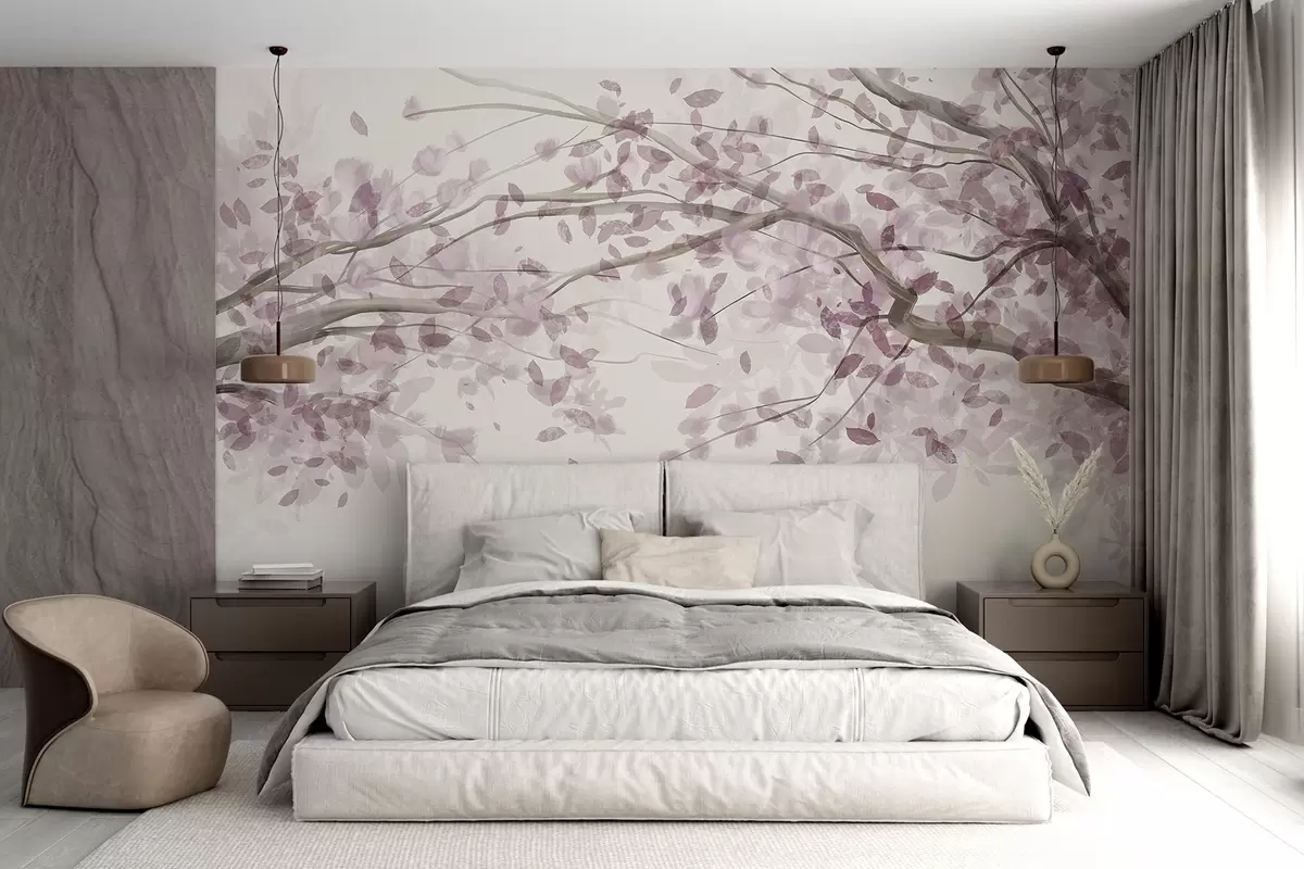 Peintures murales Branches fleuries avec feuilles roses, couleurs douces, détails délicats, style aquarelle, sur fond clair Nr. w08867