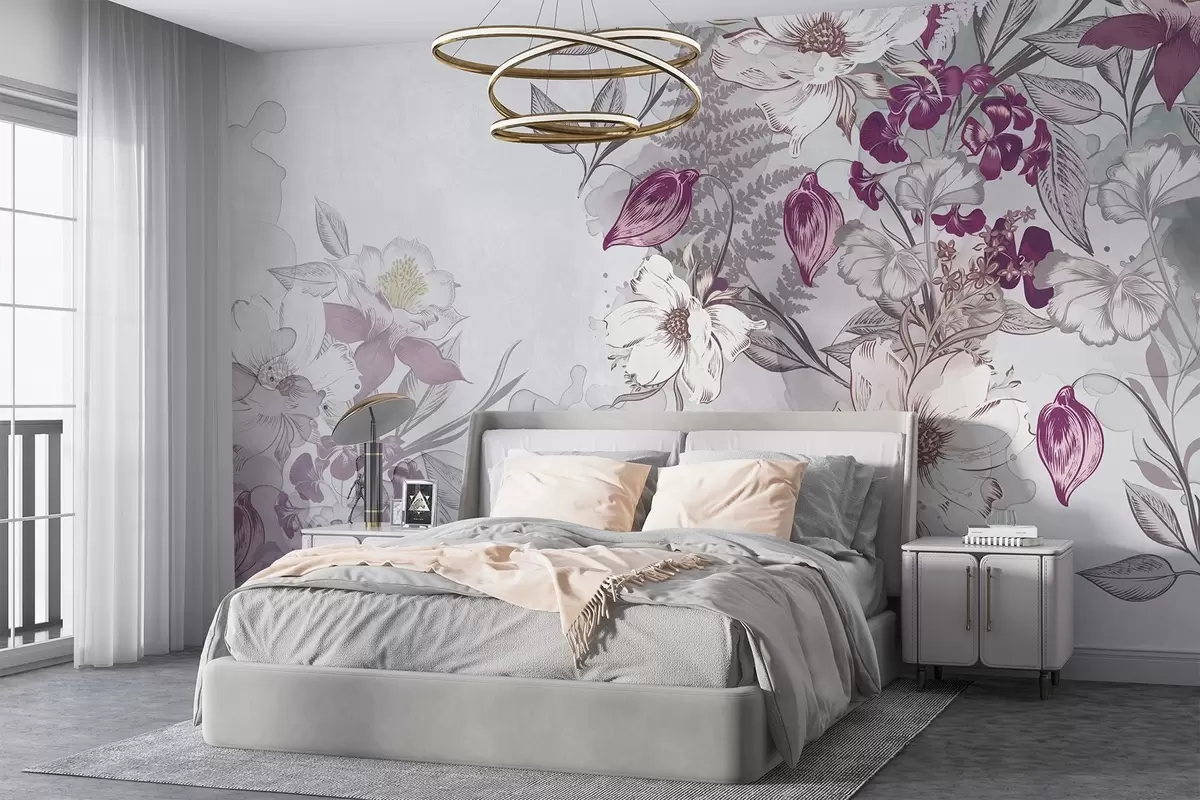 Peintures murales Fleurs avec pétales, feuilles et tiges blanches et violettes, effet aquarelle, fond texturé gris clair Nr. w08899