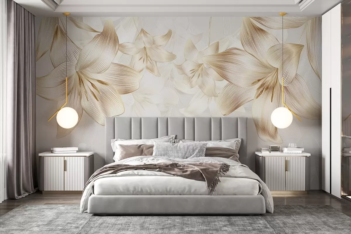 Peintures murales Lys jaunes avec détails de lignes complexes, arrangement floral élégant, palette de couleurs neutres Nr. w08912