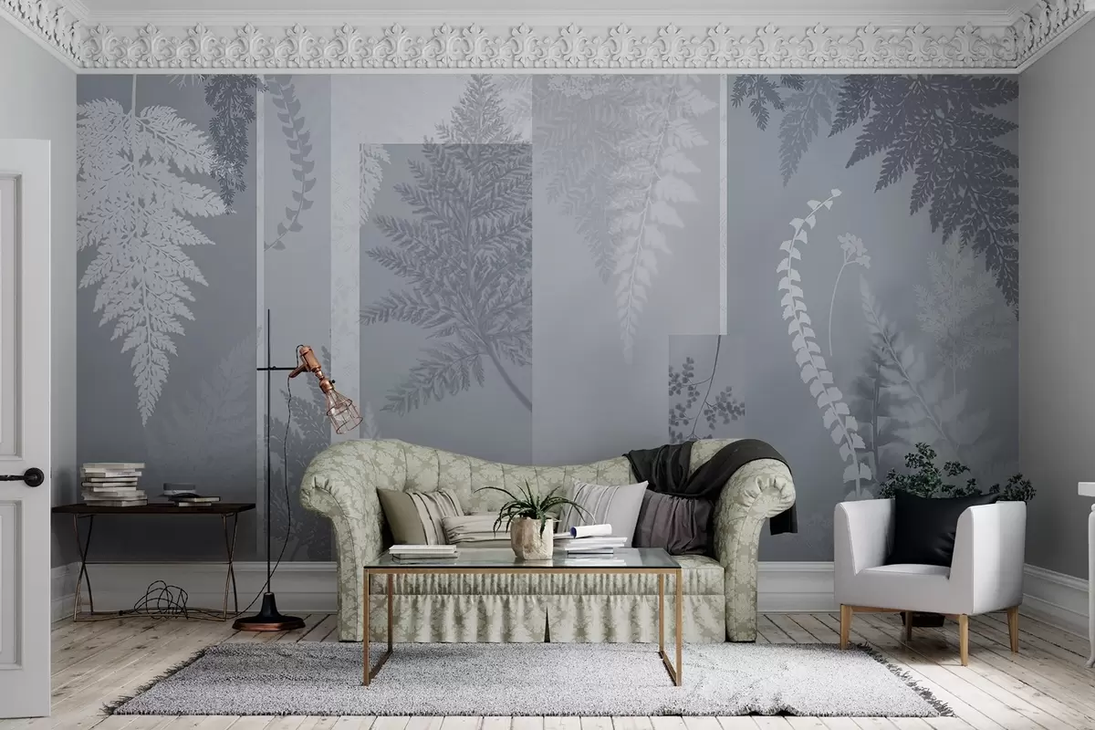 Peintures murales Feuilles de fougère bleues et blanches, disposées en bandes verticales, créant un imprimé botanique et minimaliste, aux couleurs douces et sourdes Nr. w09007v1