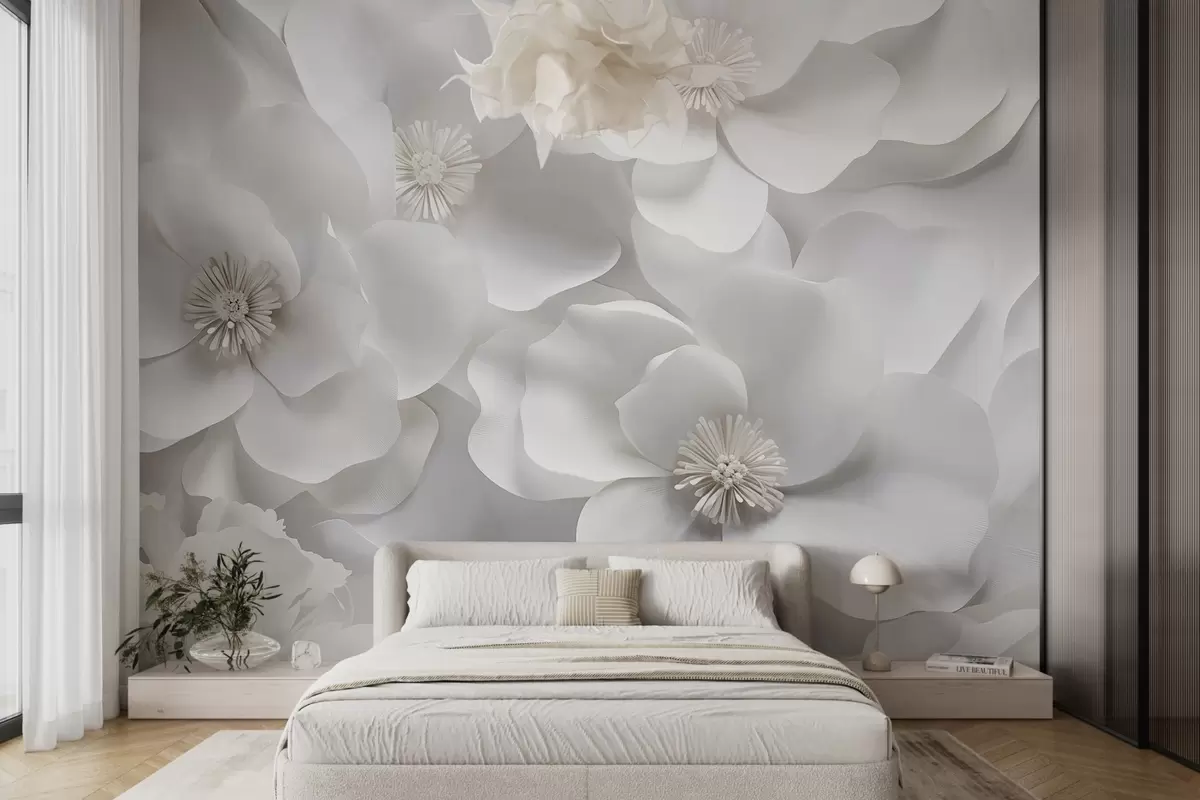 Peintures murales Fleurs blanches aux pétales délicats, disposées en grappe dense, créant un sentiment de pureté et d'élégance sur fond blanc Nr. w09053