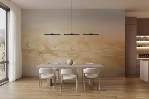 Peintures murales Paysage abstrait texturé avec des couleurs chaudes, une atmosphère douce et rêveuse, et un mélange de teintes orange, jaunes et blanches Nr. w09063