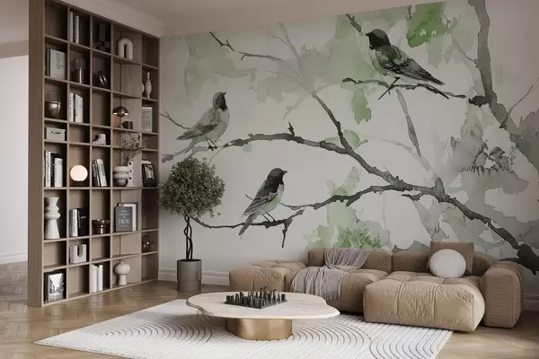 Peintures murales Oiseaux sur des branches d'arbre en style aquarelle Nr. w09064v3