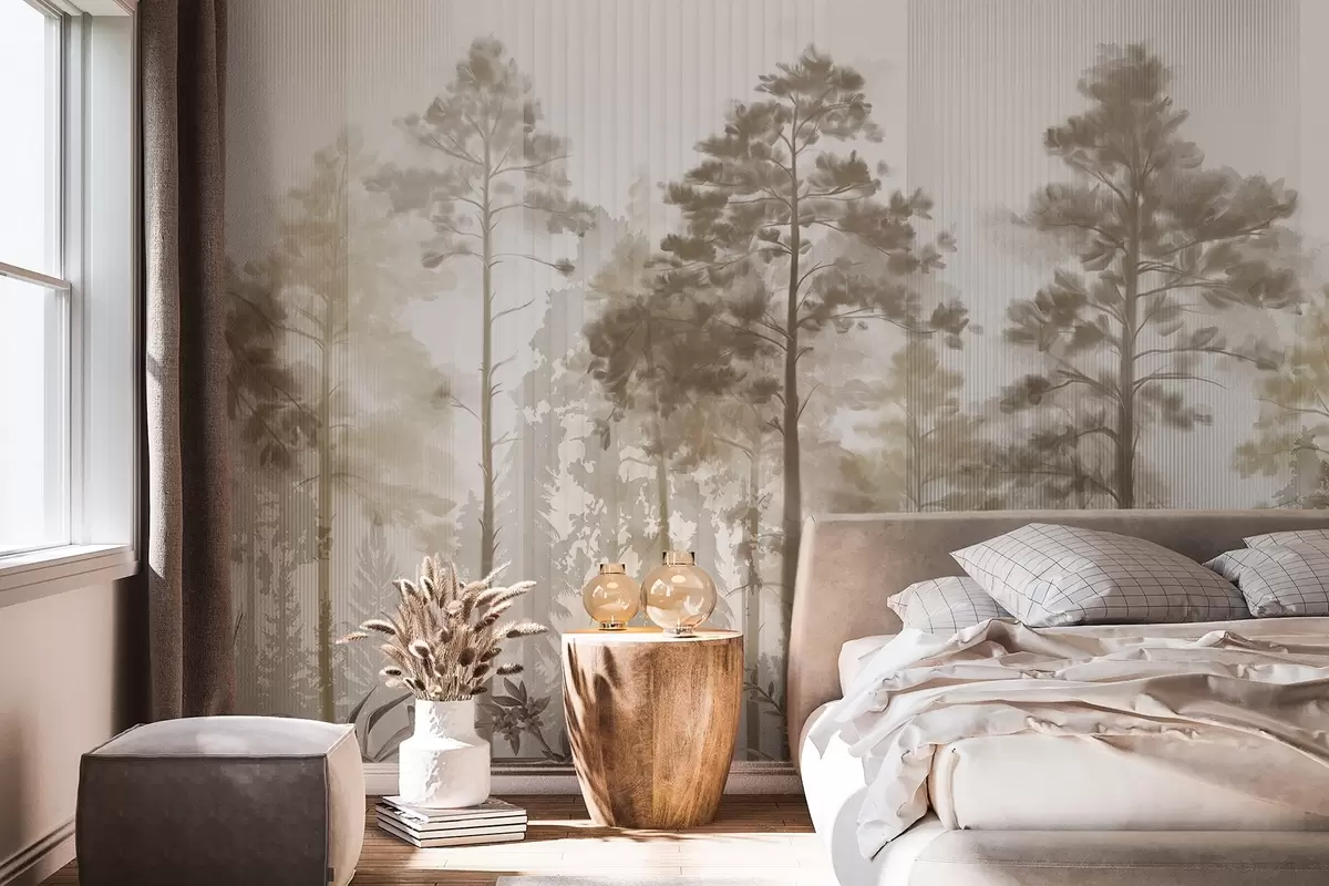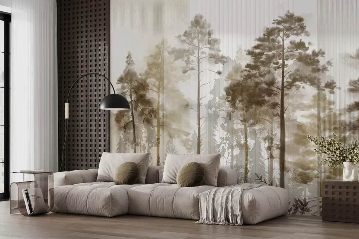 Peintures murales Une forêt dense avec de grands pins, un feuillage beige luxuriant, une atmosphère brumeuse avec des textures de lignes verticales Nr. w09163v1