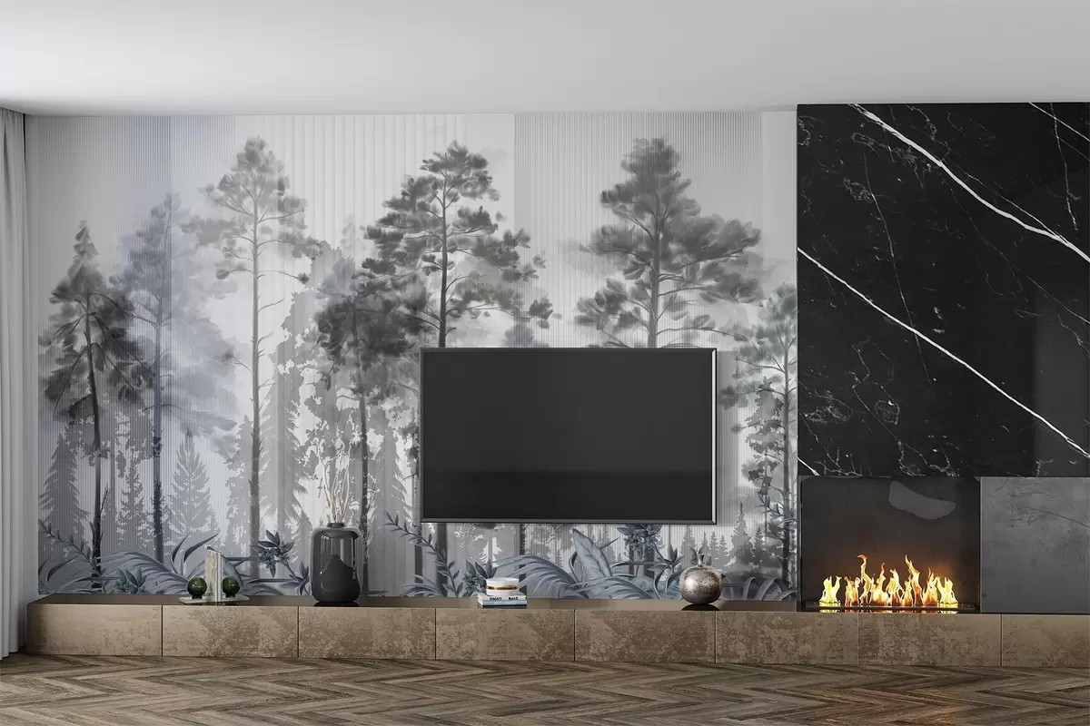 Peintures murales Une forêt dense avec de grands pins, un feuillage gris et luxuriant, une atmosphère brumeuse avec des textures de lignes verticales Nr. w09163v2