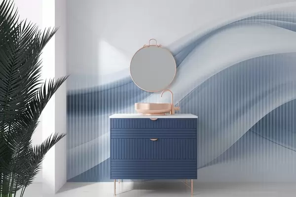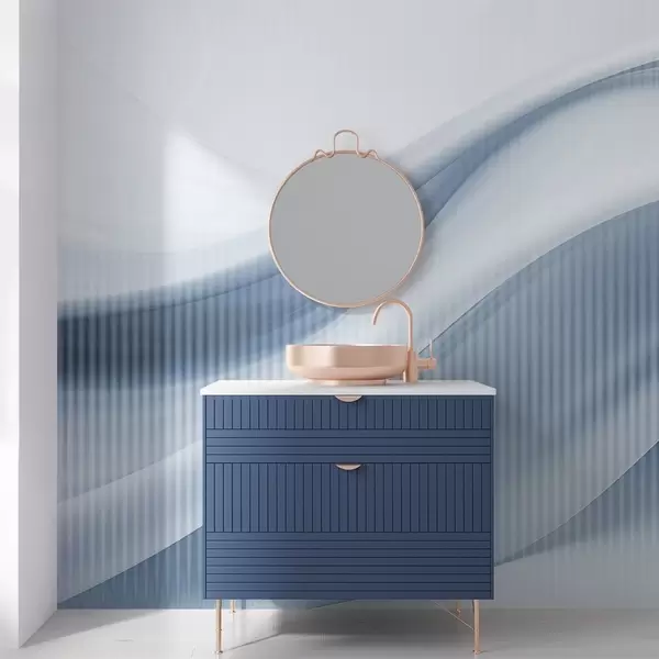 Murale Impression abstraite avec des lignes fluides et de subtiles rayures verticales, créant un sentiment de mouvement et de profondeur, palette bleue w09189v1