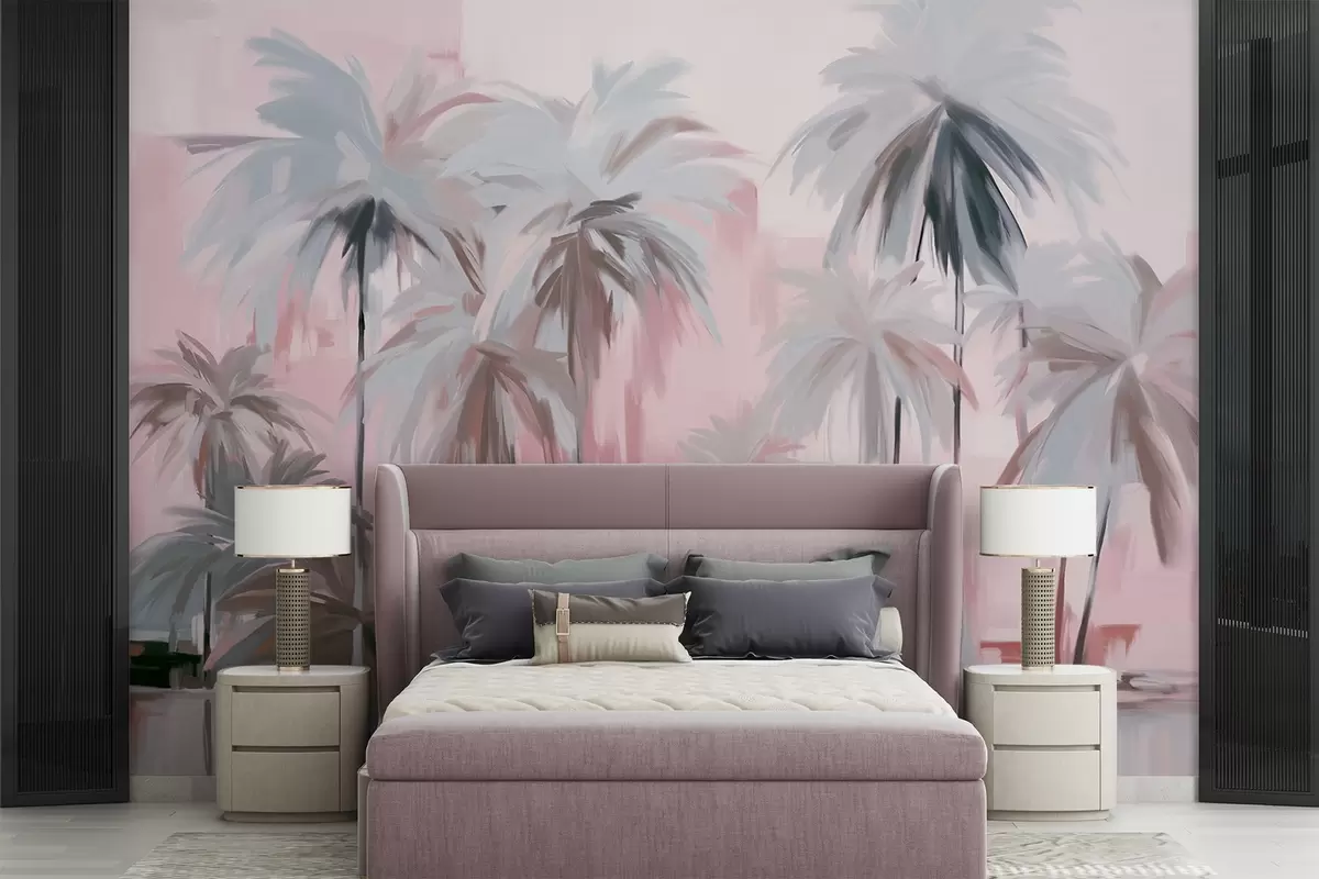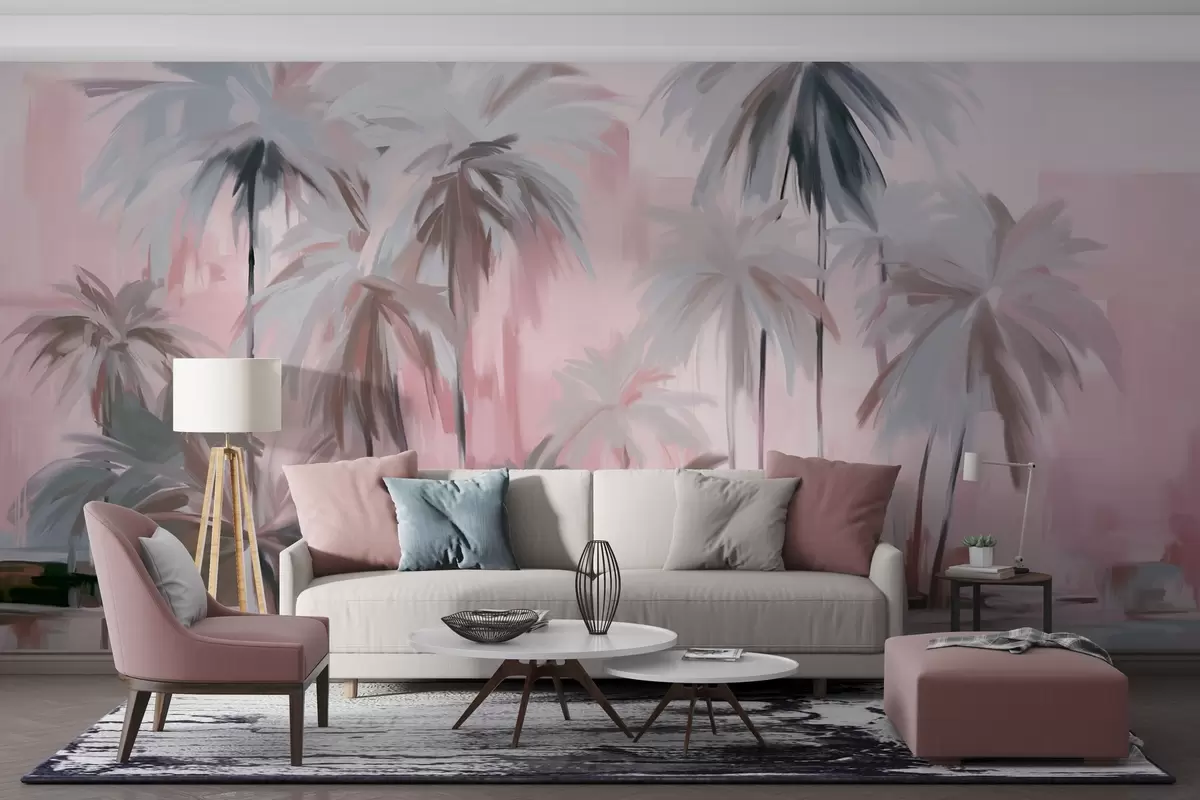 Peintures murales Palmiers tropicaux abstraits, minimalistes et pastel, sur un fond de teintes sourdes roses et grises Nr. w09212v1