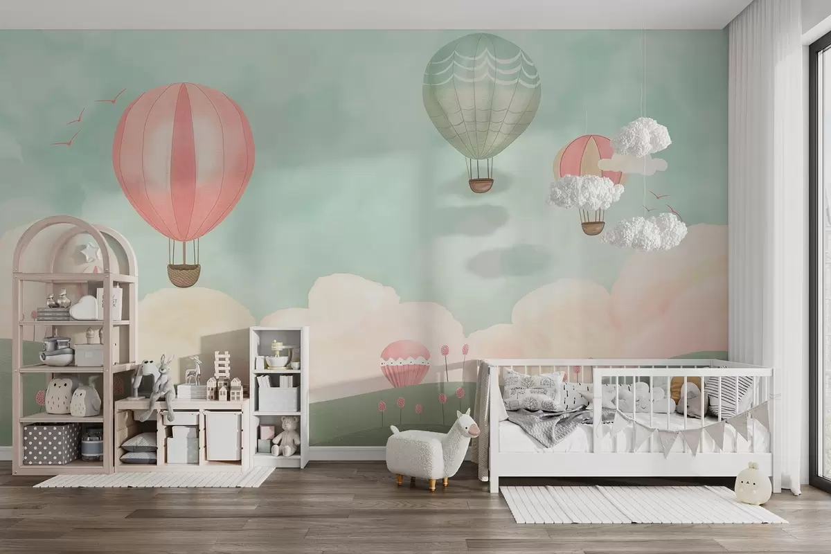 Peintures murales Montgolfières au-dessus de collines avec des nuages Nr. w09228