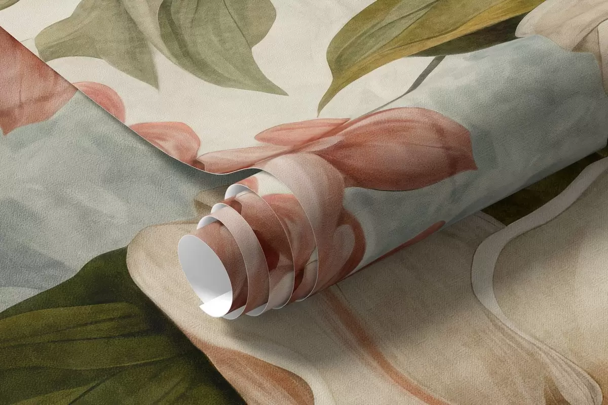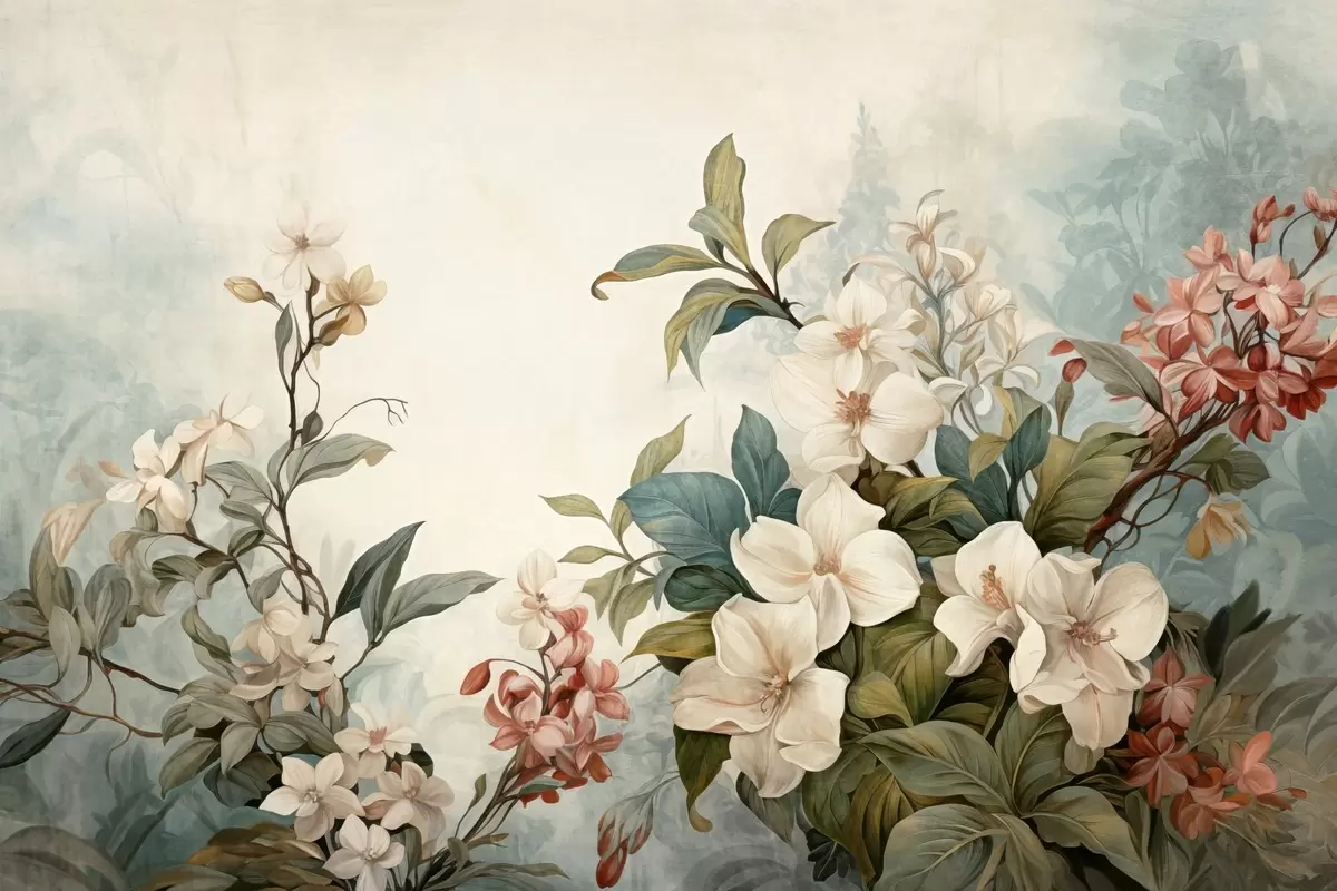 Peintures murales Fleurs et feuilles tropicales texturées avec des teintes bleues et vertes douces, coups de pinceau délicats, style botanique vintage Nr. w09259