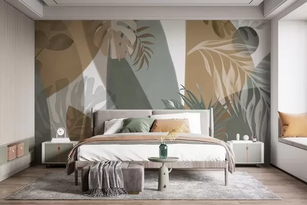 Peintures murales Feuilles de monstera et feuilles de palmier dans un motif aux couleurs brunes, blanches et vertes, ambiance tropicale, formes abstraites, décoratif Nr. w09288