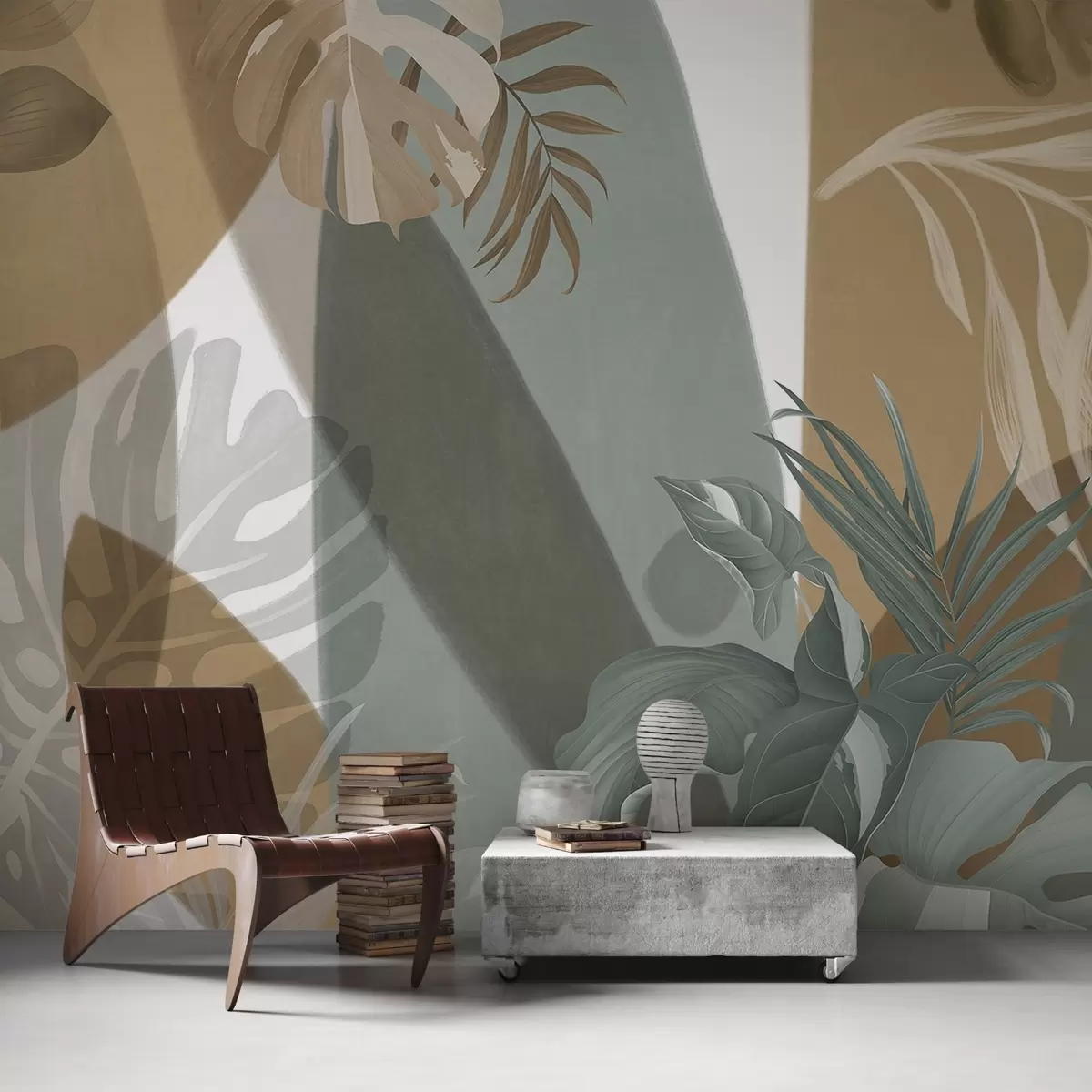 Murale Feuilles de monstera et feuilles de palmier dans un motif aux couleurs brunes, blanches et vertes, ambiance tropicale, formes abstraites, décoratif w09288