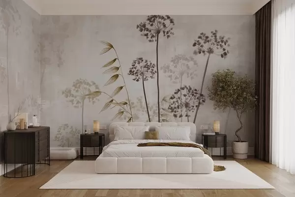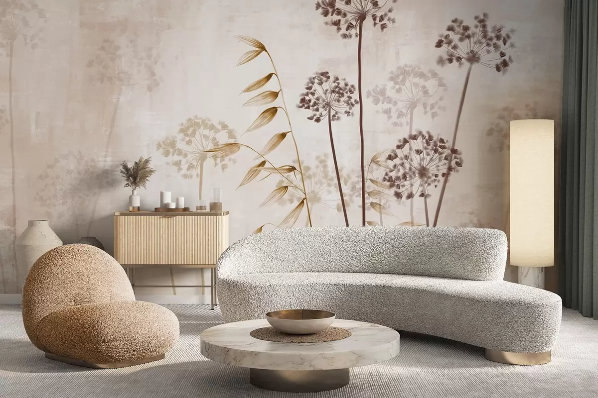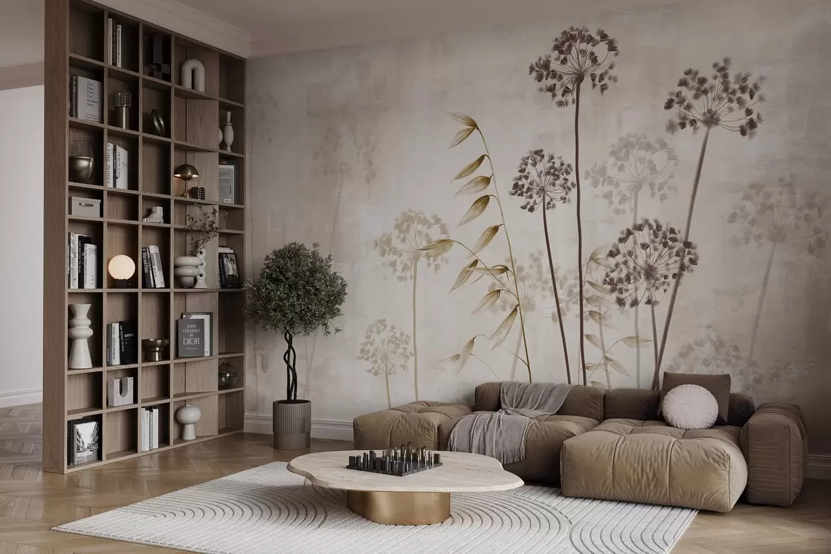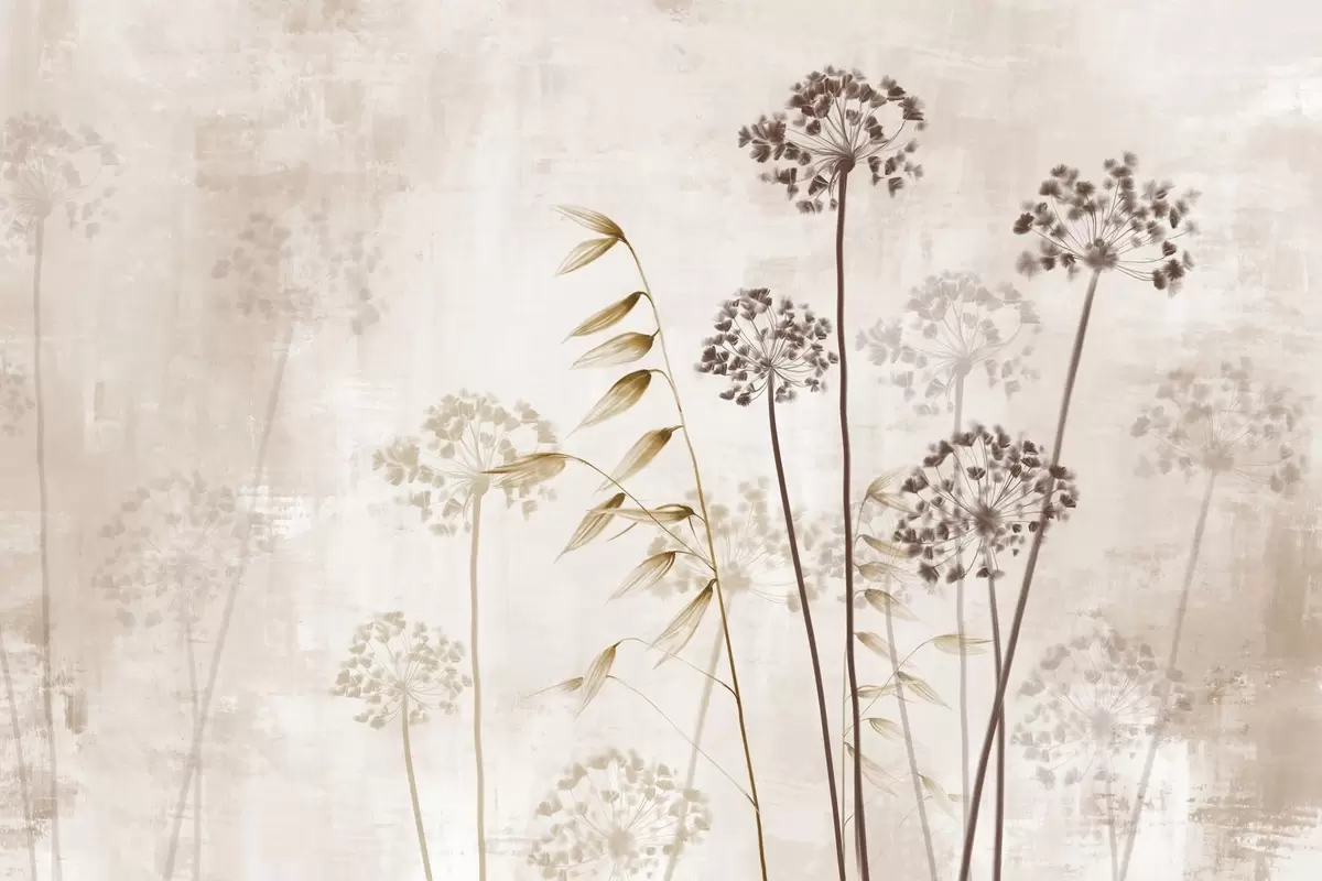 Peintures murales Dessin de fleurs séchées avec de longues tiges, palette monochrome, sur un fond texturé beige clair, illustration botanique Nr. w09314v1