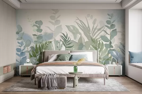 Peintures murales Plantes vertes pastel, fougères, monstres et eucalyptus, fond texturé léger, éclairage doux, paisible, illustration botanique Nr. w09316