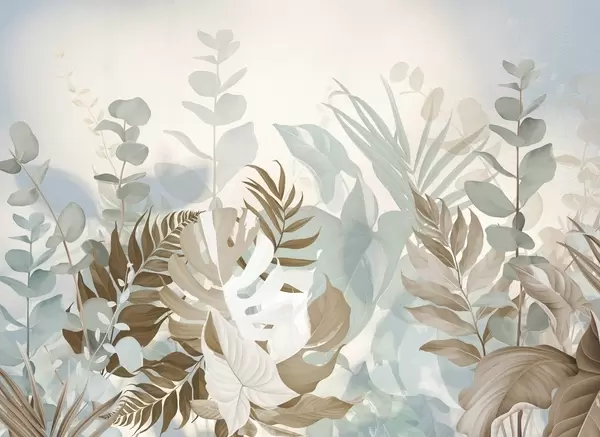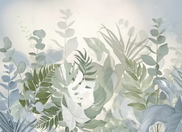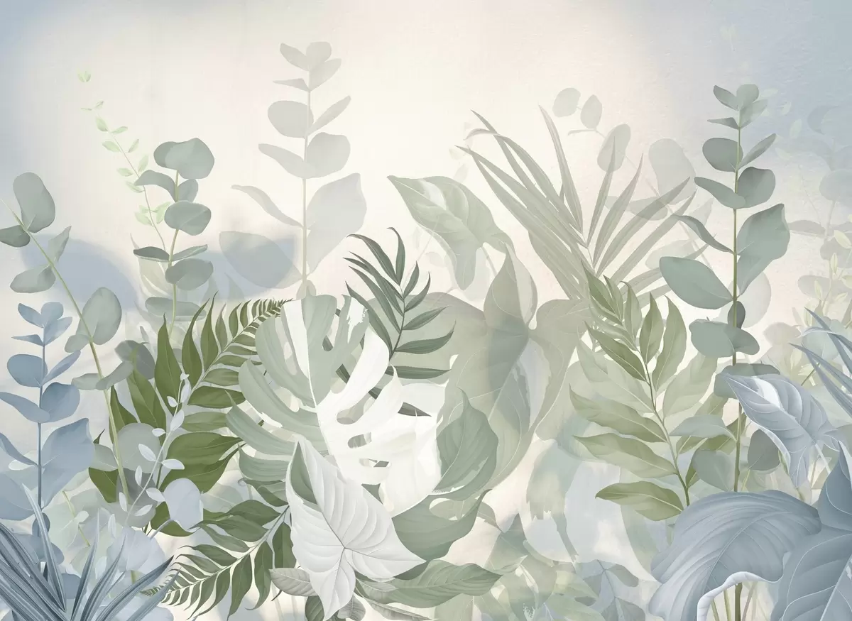 Peintures murales Plantes vertes pastel, fougères, monstres et eucalyptus, fond texturé léger, éclairage doux, paisible, illustration botanique Nr. w09316