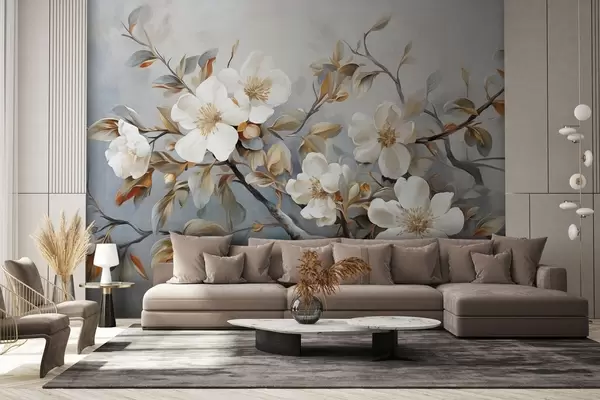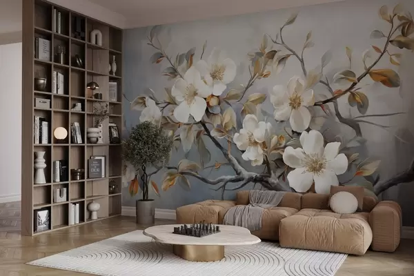 Peintures murales Fleurs blanches avec pistils jaunes sur une branche d'arbre avec des feuilles, fond clair, style peinture vintage, impression texturée Nr. w09368