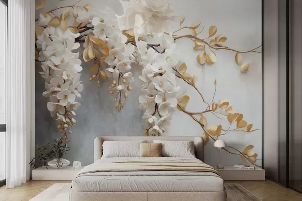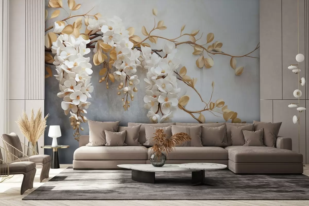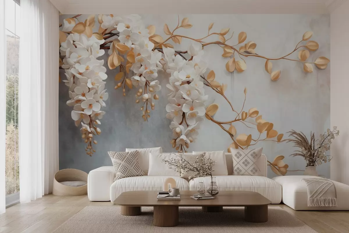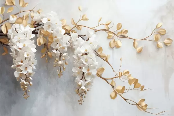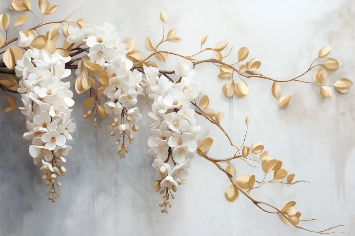 Peintures murales Fleurs de glycine blanche avec feuilles jaunes sur une branche, tombant en cascade sur un fond blanc texturé, pétales délicats Nr. w09381