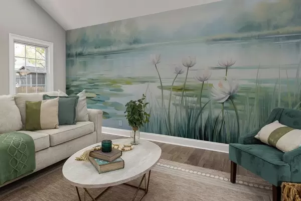 Peintures murales Paysage avec un lac, des nénuphars et des feuilles de nénuphars, des arbres en arrière-plan, dans un environnement calme, tons bleu clair et vert Nr. w09395