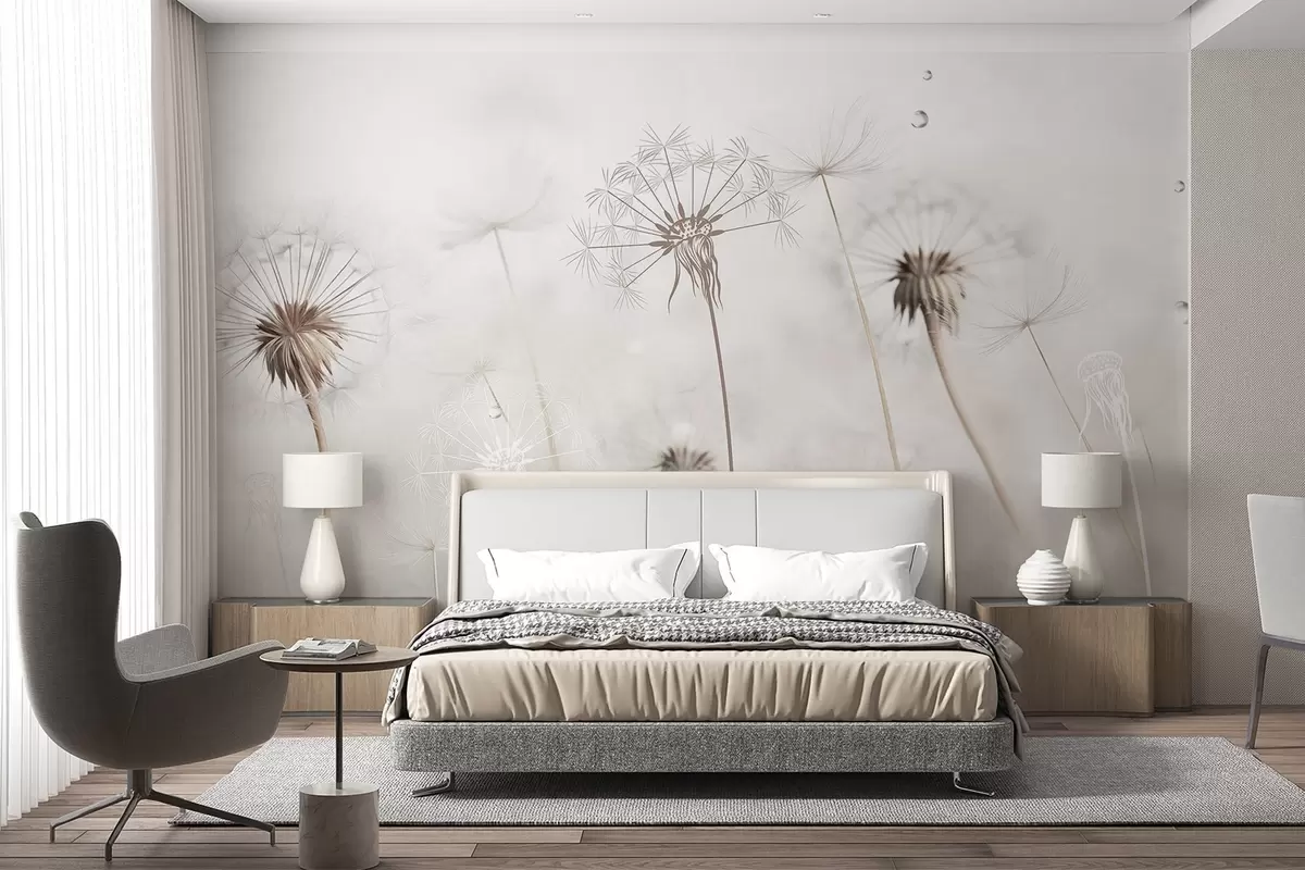 Peintures murales Pissenlits avec gouttes d'eau, fond blanc, gros plan, lumière douce, nature, botanique, éthéré, délicat, minimaliste Nr. w09399
