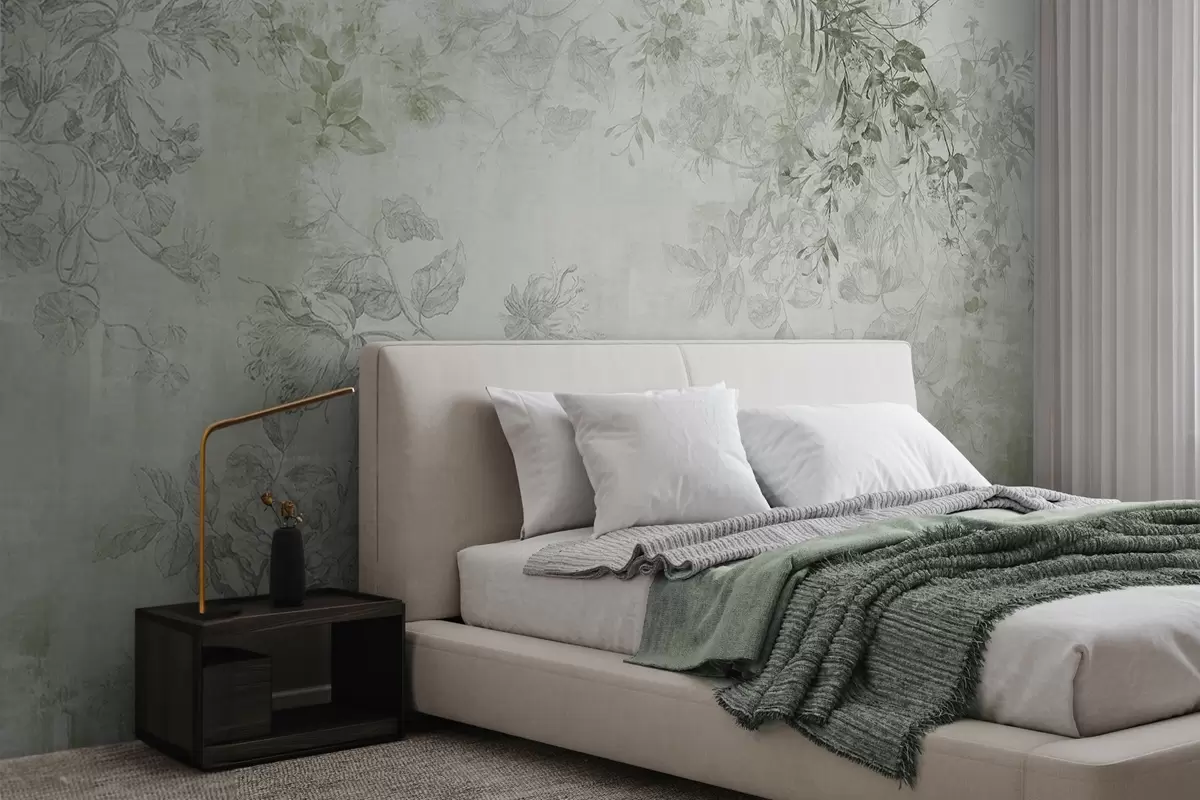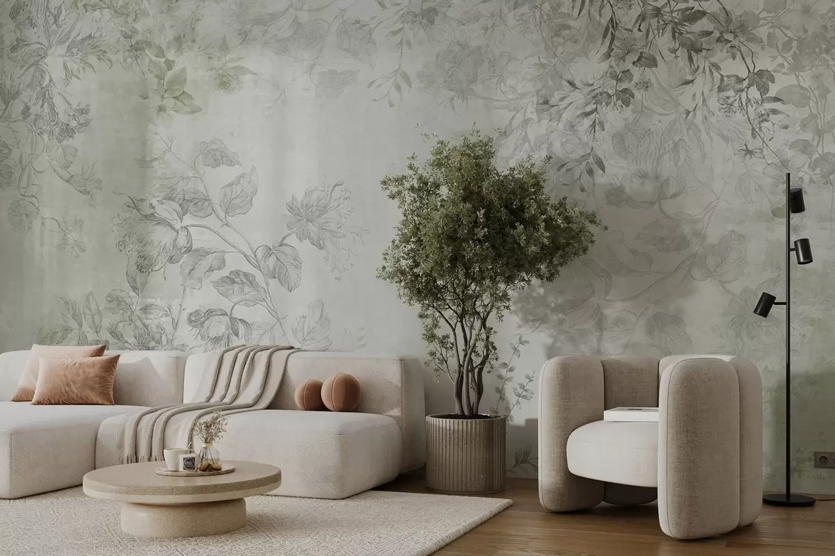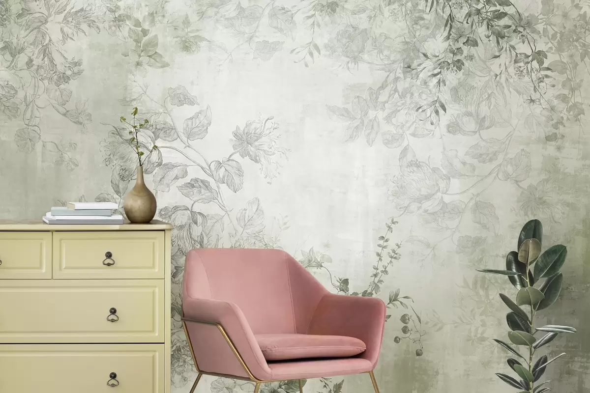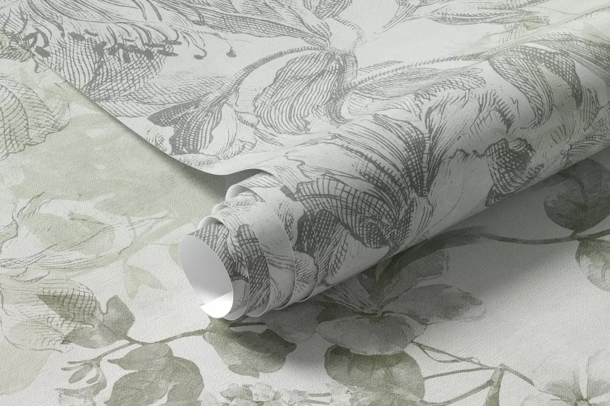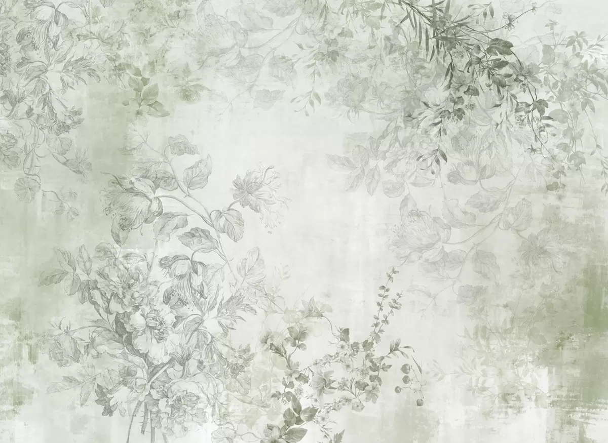 Peintures murales Art floral vintage texturé avec des illustrations délicates de fleurs et de feuilles de jardin dessinées, dans des tons verts doux Nr. w09402v2