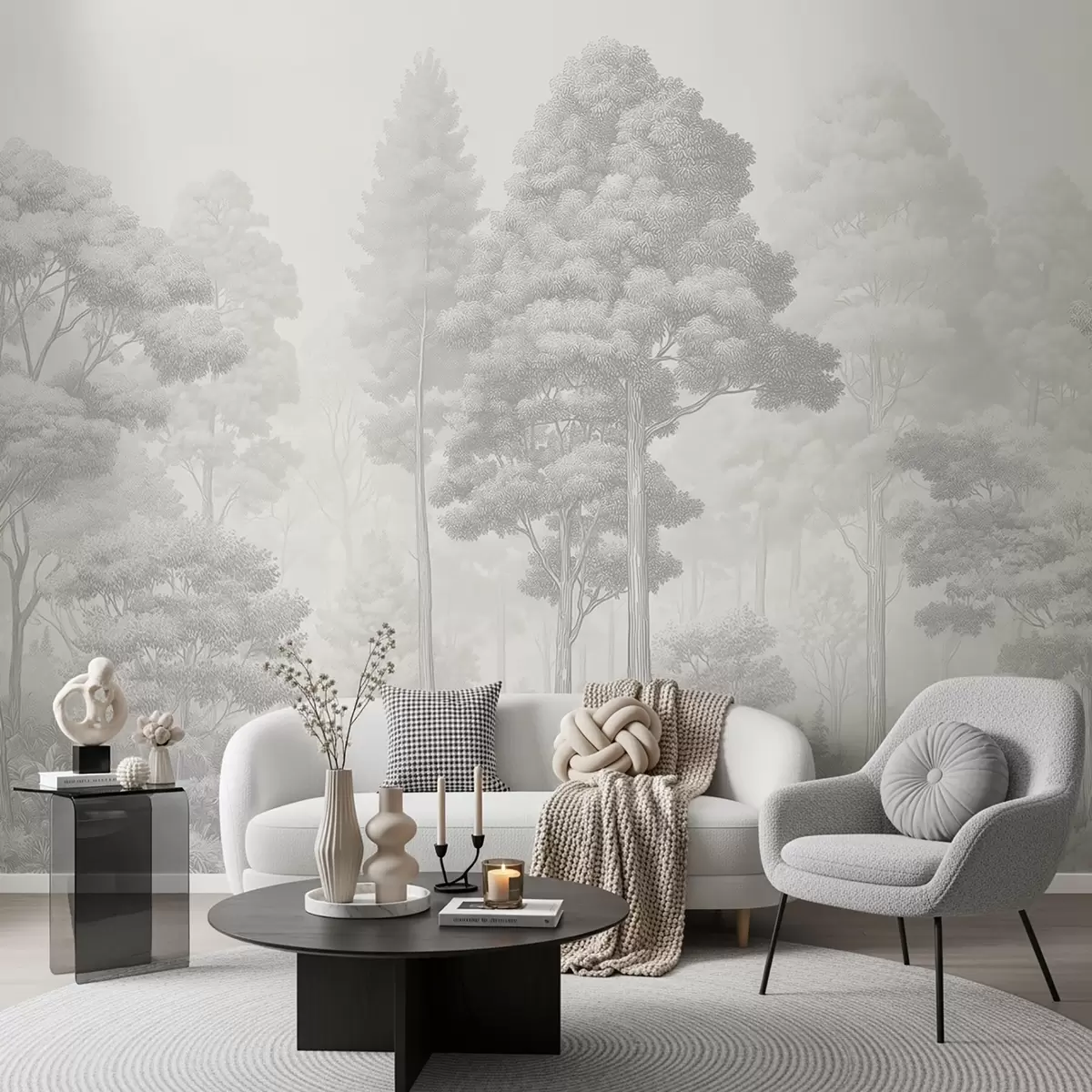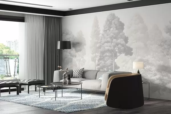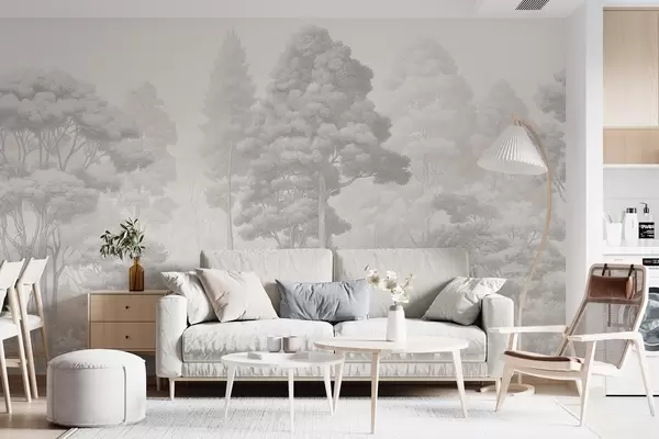 Peintures murales Paysage forestier artistique réalisé selon la technique du hachurage graphique en noir et blanc Nr. w09411