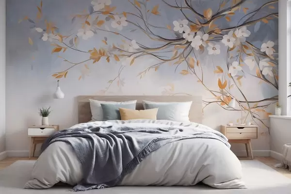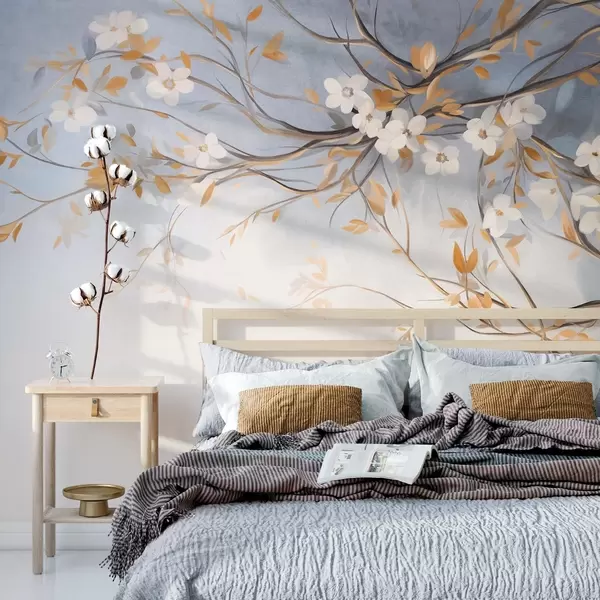Peintures murales Fleurs blanches avec des feuilles orange sur une branche d'arbre, fond texturé bleu clair, coups de pinceau délicats Nr. w09415