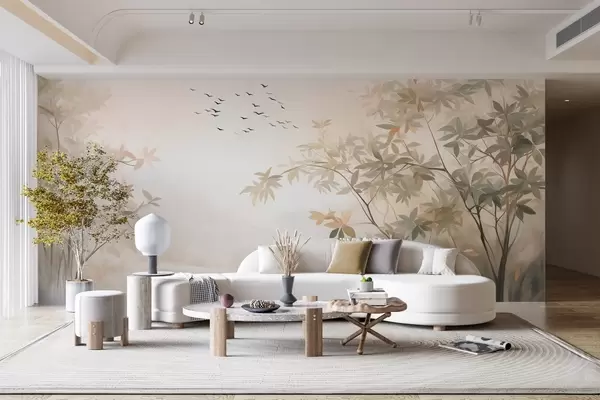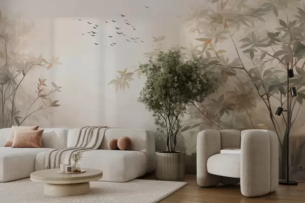Peintures murales Paysage texturé avec des arbres et une volée d'oiseaux volant dans le ciel, couleurs pastel, scène naturelle Nr. w09418