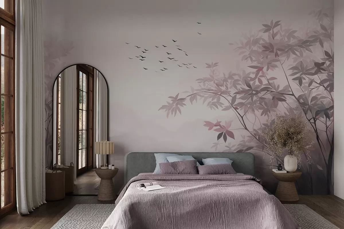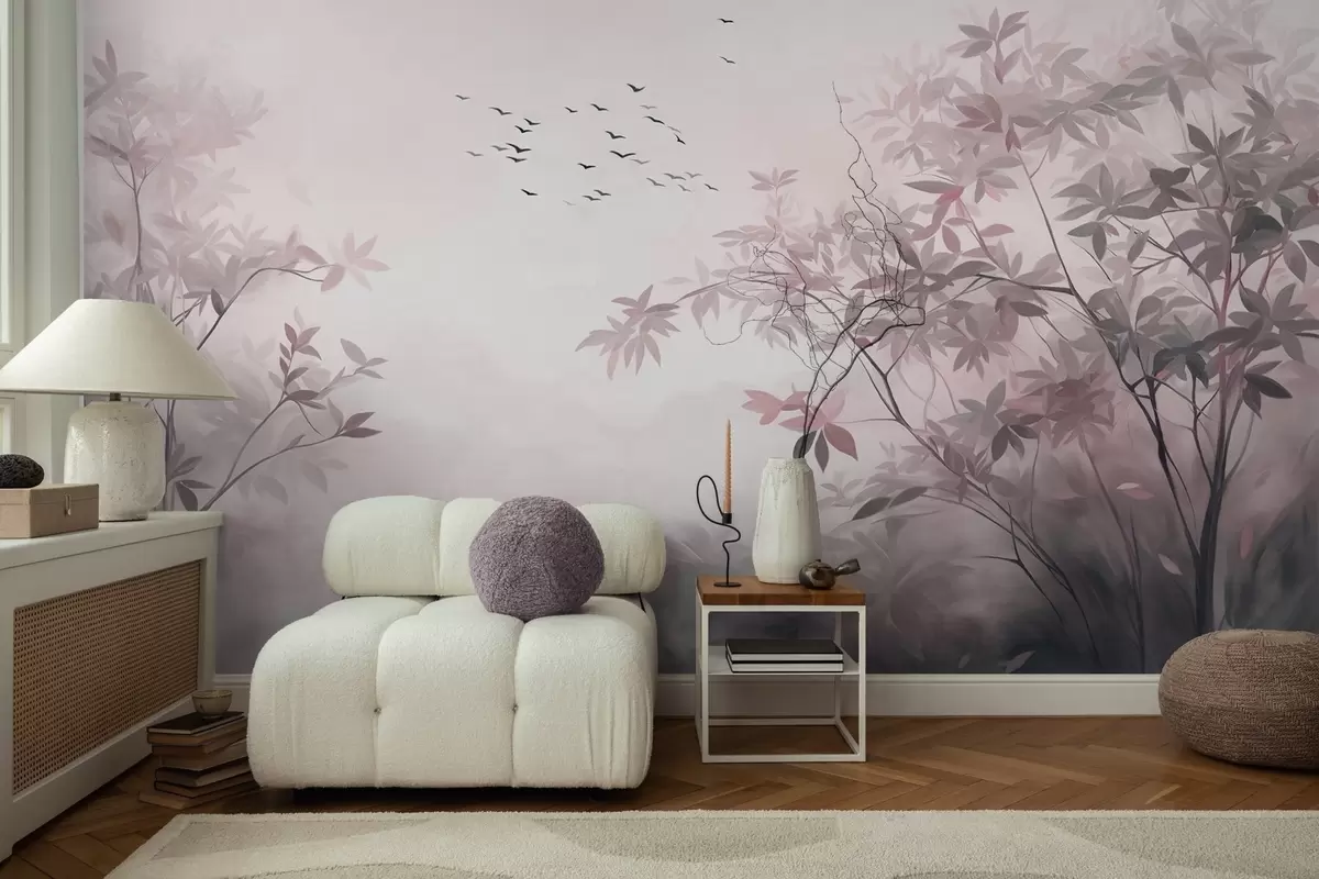 Peintures murales Paysage texturé avec des arbres et une volée d'oiseaux volant dans le ciel, couleurs pastel, scène naturelle Nr. w09418v1